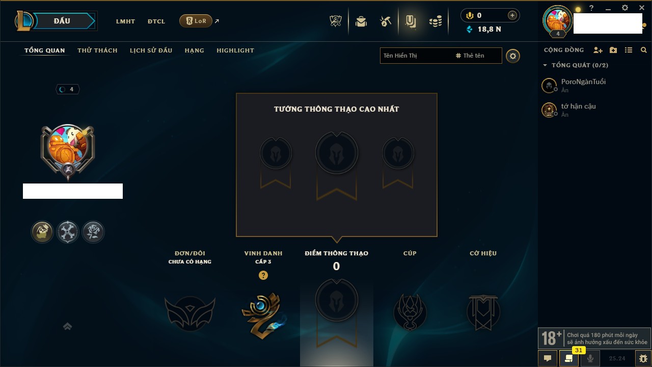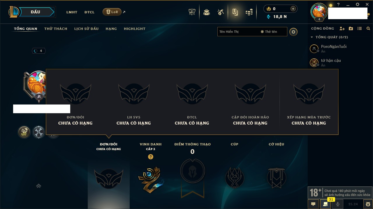 Rank Đơn: Chưa RankKhung: Bạch kimTướng: 171 - Còn 182788 THXTrang Phục: 158Rank ĐTCL: Chưa RankLinh Thú: 56