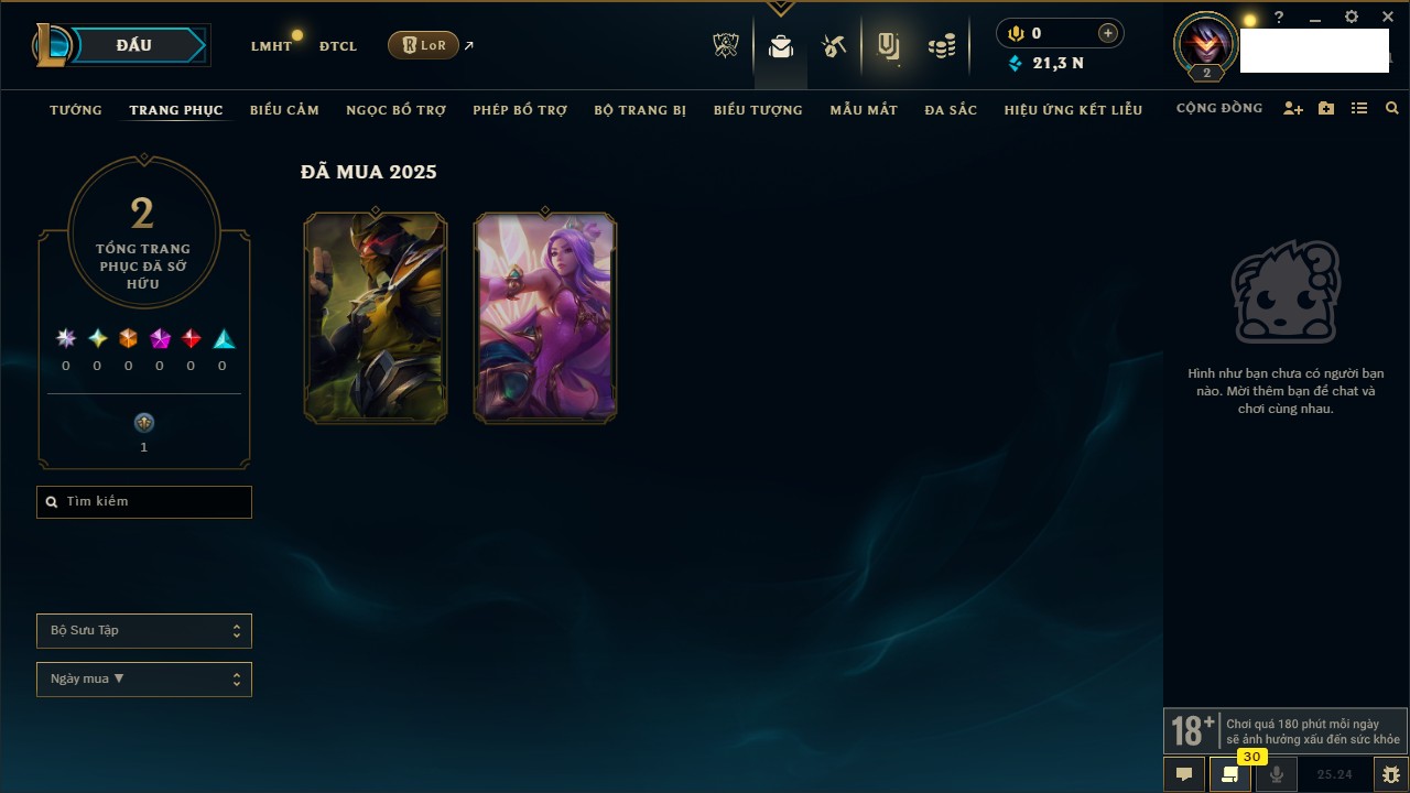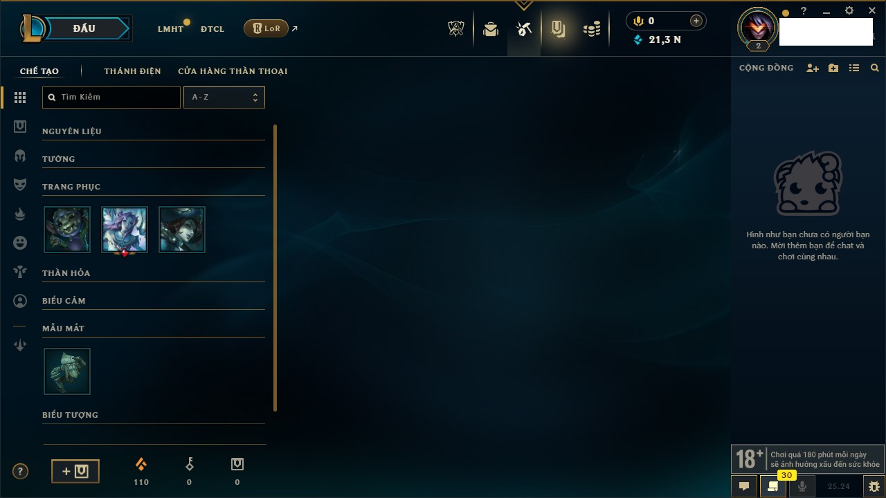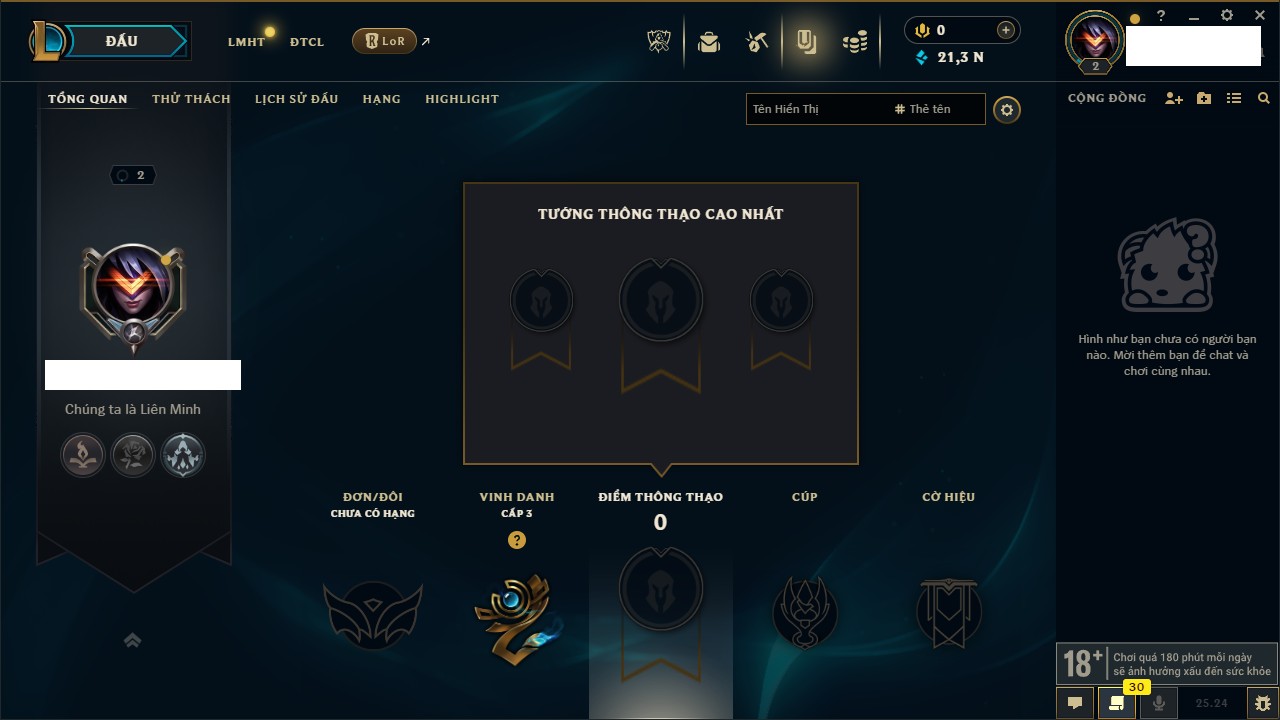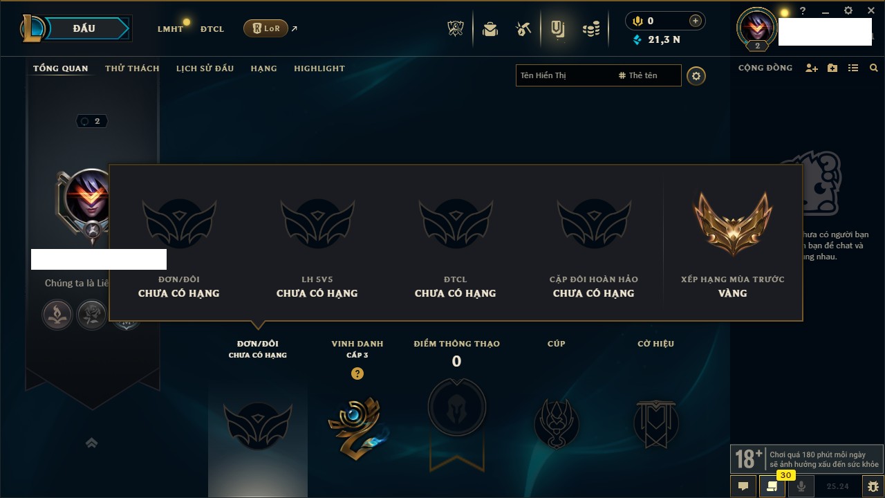 Rank Đơn: Chưa Rank Khung: Bạch kim Tướng: 145 - Còn 9448 THX Trang Phục: 62 Rank ĐTCL: Chưa Rank Linh Thú: 130