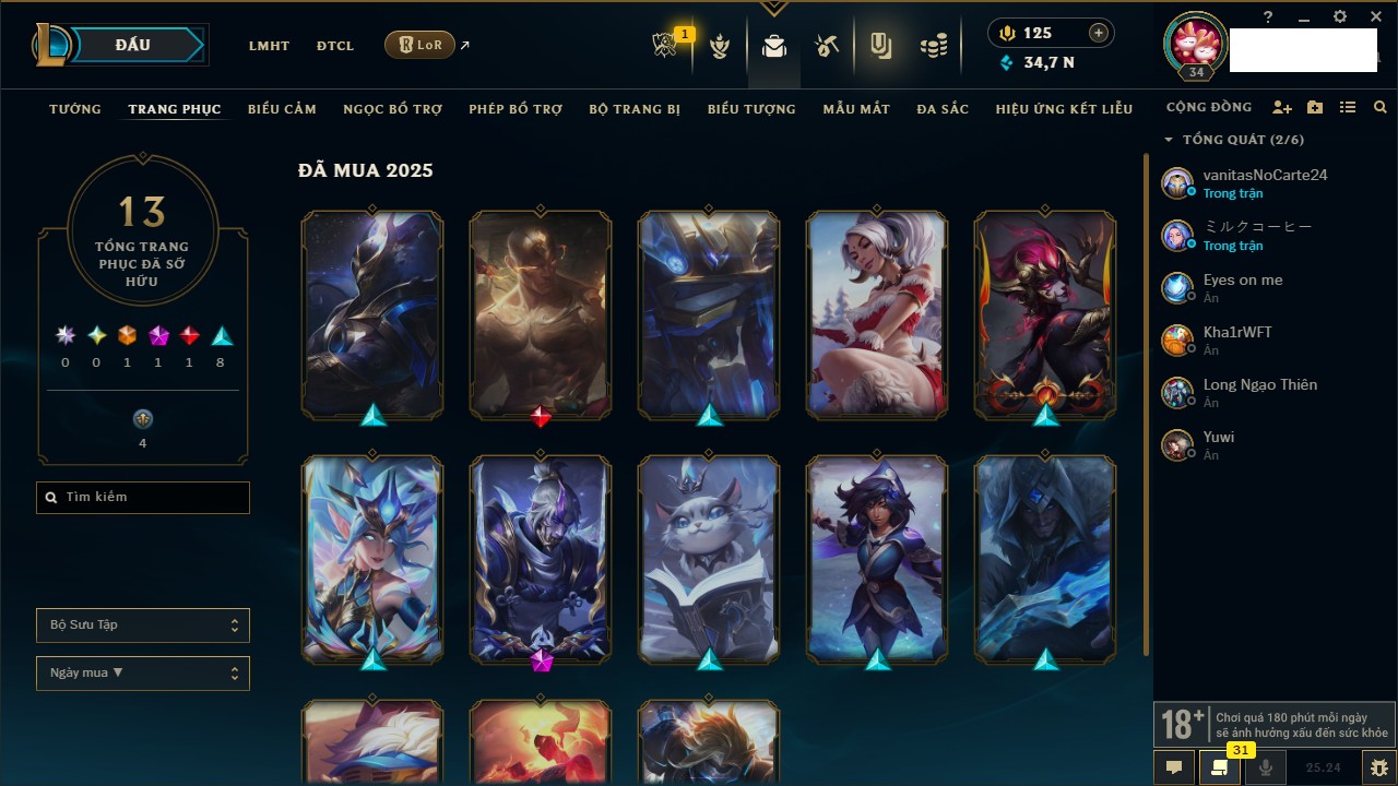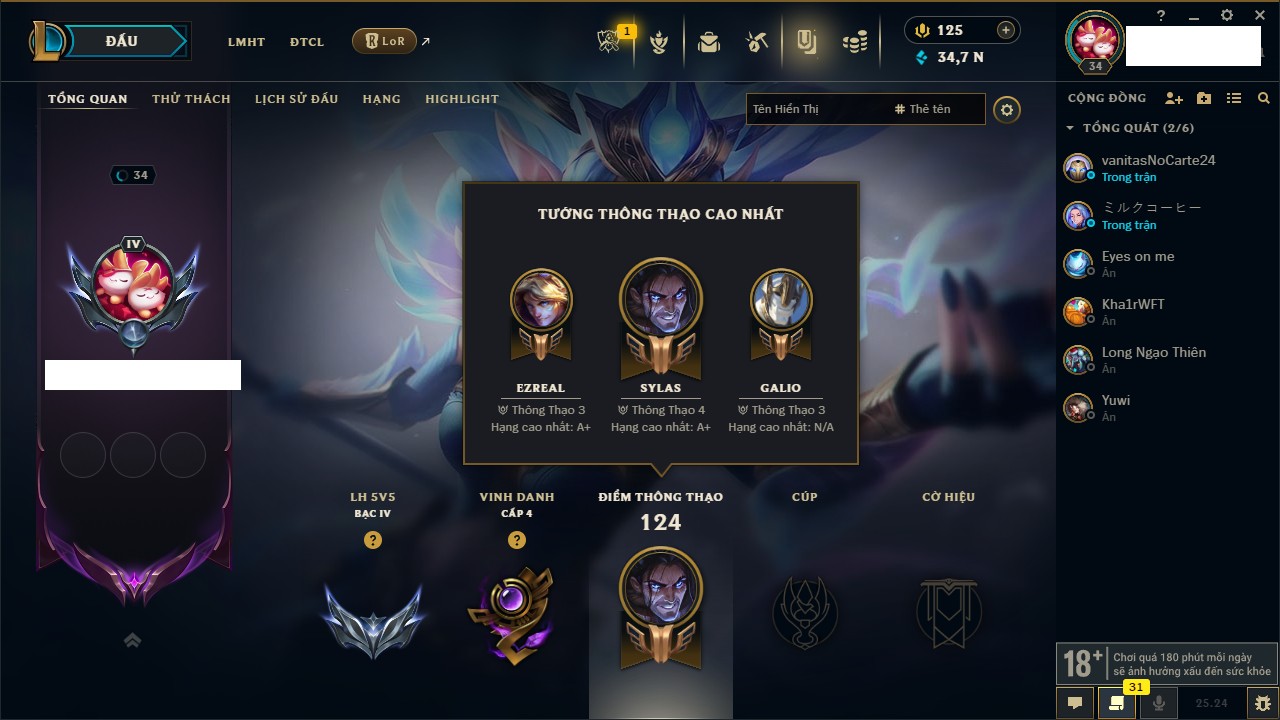 Rank Đơn: Chưa rank mùa nàoKhung: Chưa có khungTướng: 35 - Còn 14070 THXTrang Phục: 8Rank ĐTCL: Chưa RankLinh Thú: 72
