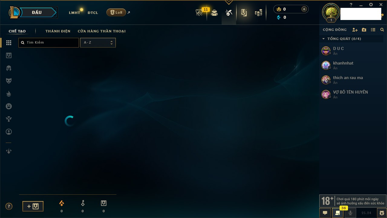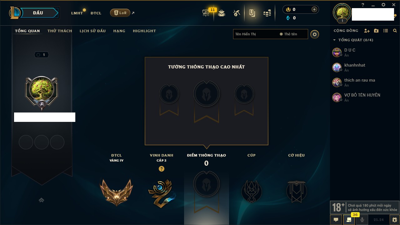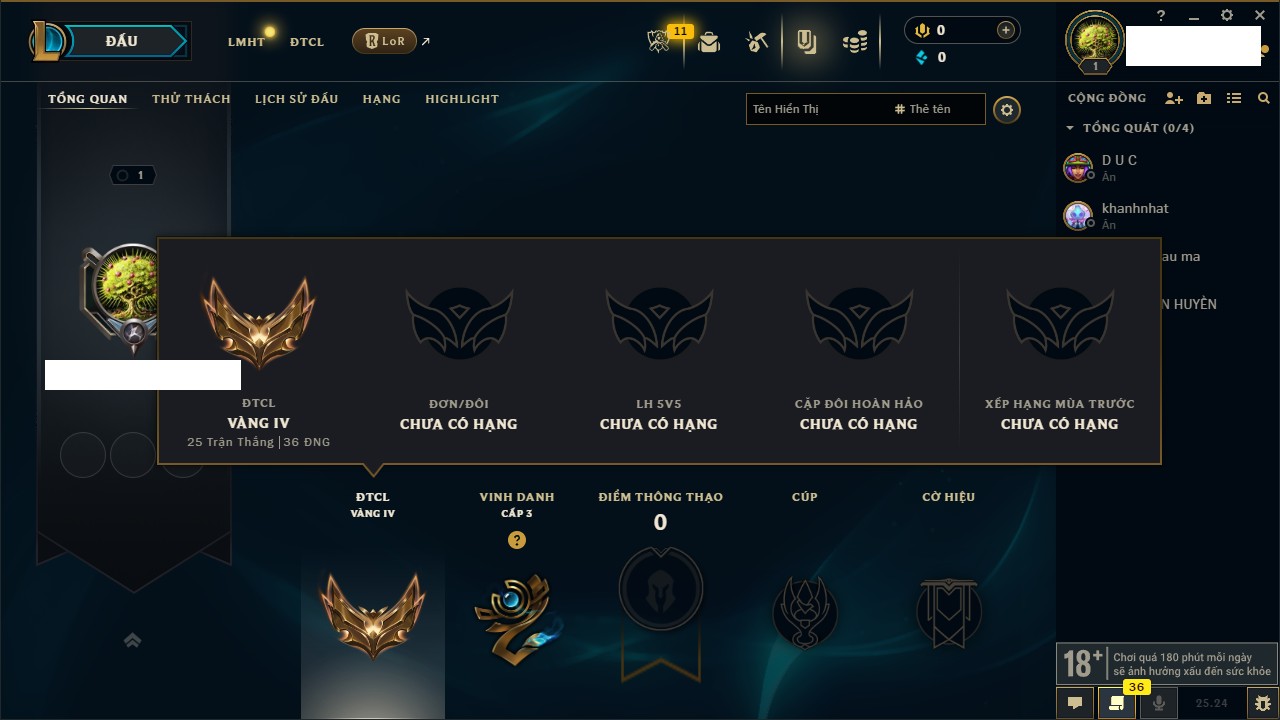 Rank Đơn: Chưa RankKhung: Chưa có khungTướng: 0 - Còn 0 THXTrang Phục: 0Rank ĐTCL: Chưa RankLinh Thú: 13