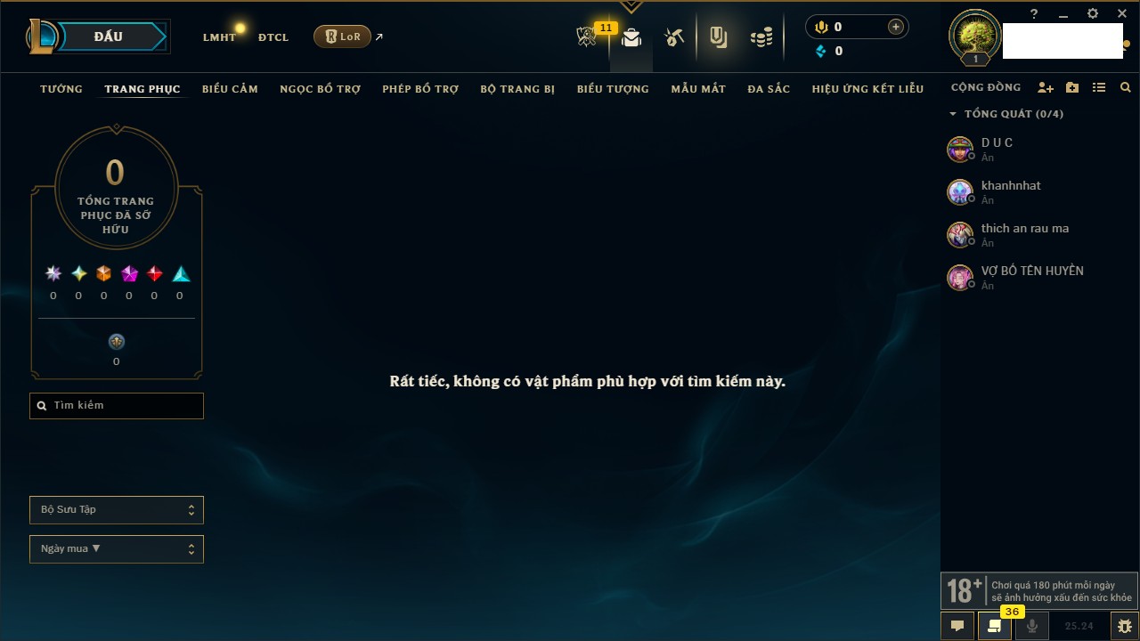 Rank Đơn: Chưa RankKhung: Chưa có khungTướng: 22 - Còn 1295 THXTrang Phục: 1Rank ĐTCL: Chưa RankLinh Thú: 5