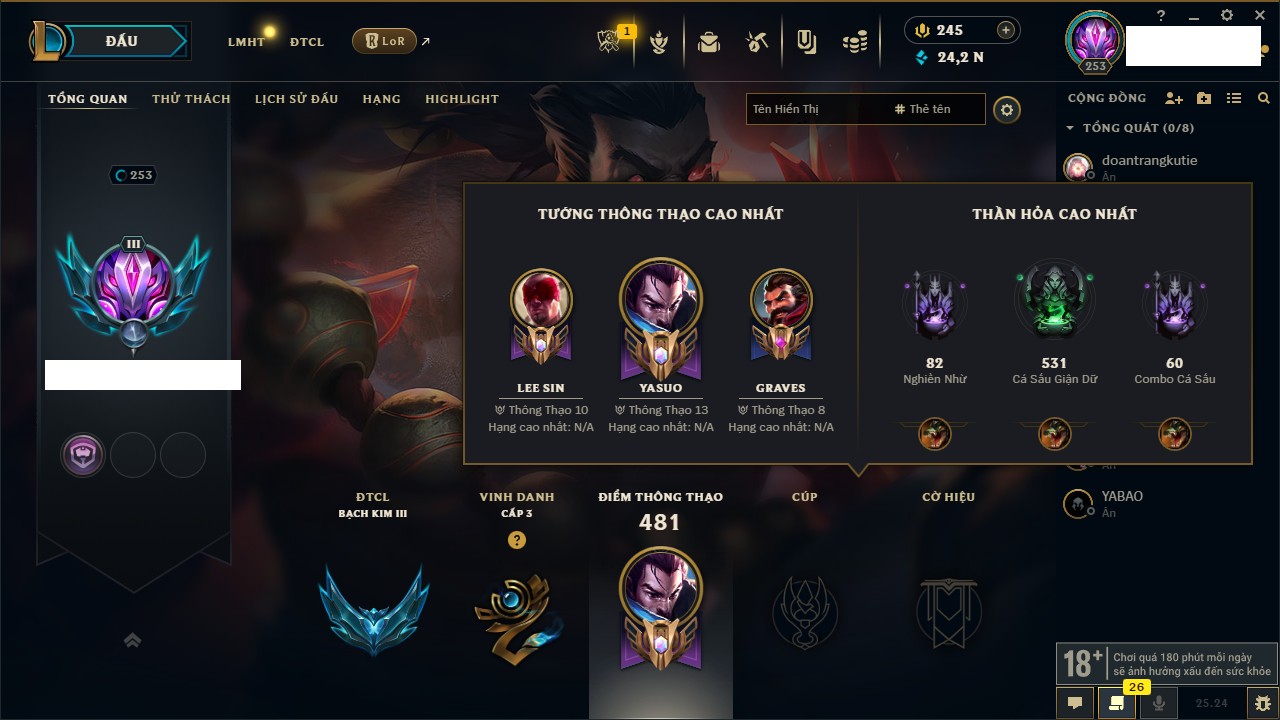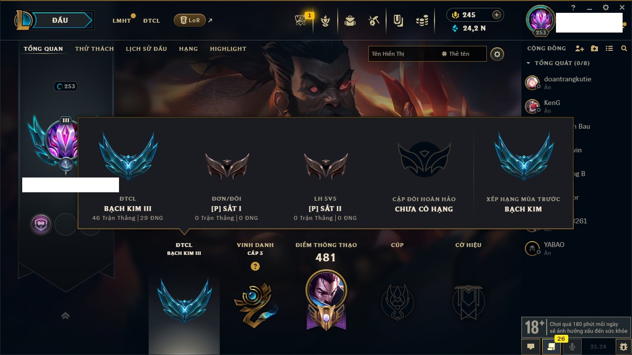 Rank Đơn: Chưa RankKhung: Bạch kimTướng: 172 - Còn 81 THXTrang Phục: 226Rank ĐTCL: Chưa RankLinh Thú: 193