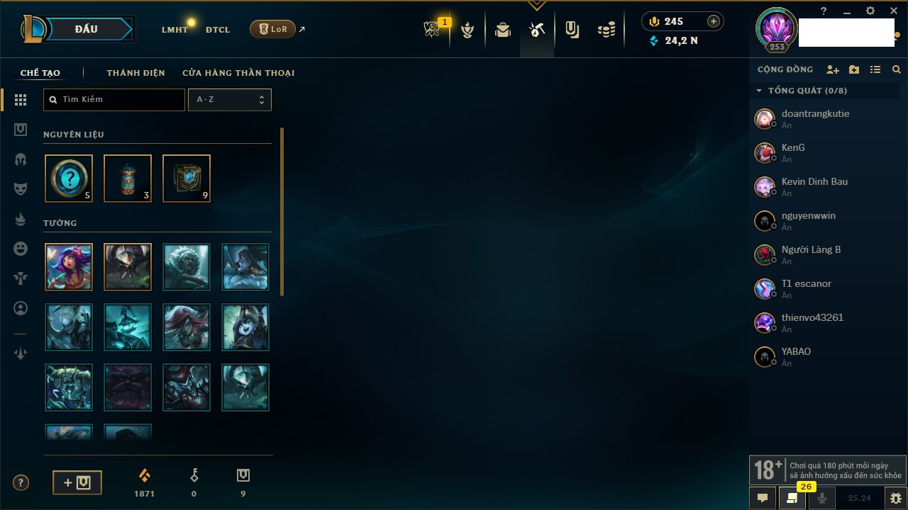 Rank Đơn: Chưa RankKhung: Chưa có khungTướng: 157 - Còn 2008 THXTrang Phục: 206Rank ĐTCL: Chưa RankLinh Thú: 29