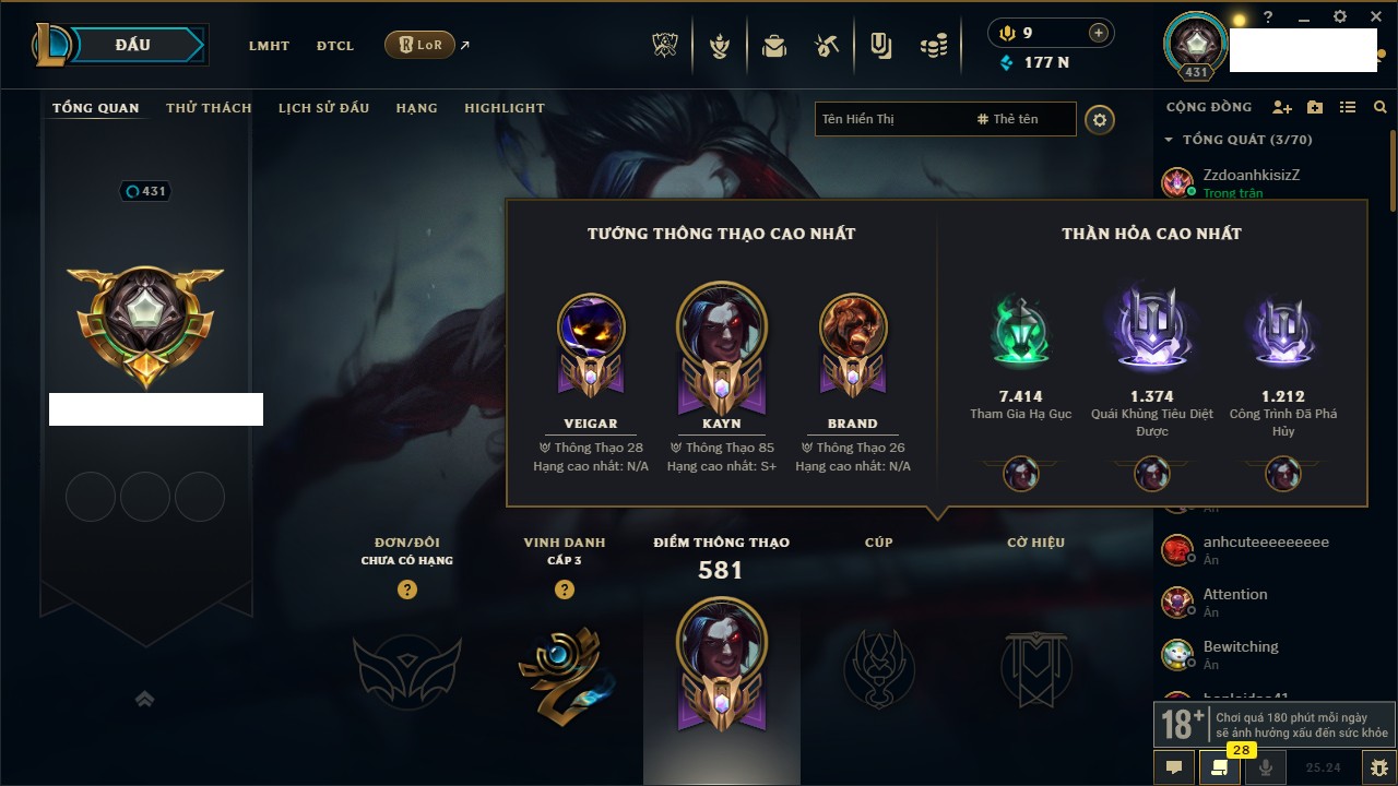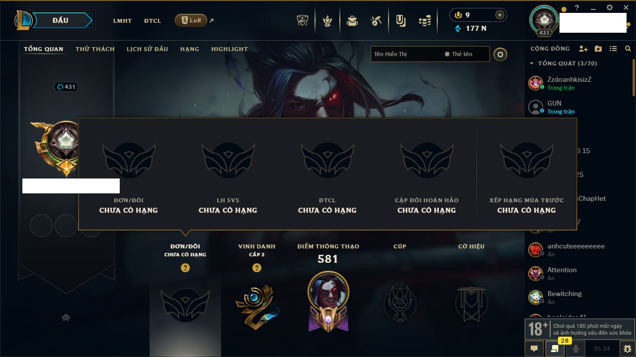 Rank Đơn: Chưa rank mùa nàoKhung: Chưa có khungTướng: 0 - Còn 15550 THXTrang Phục: 0Rank ĐTCL: Chưa rank mùa nàoLinh Thú: 18