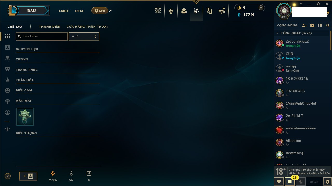 Rank Đơn: Chưa RankKhung: Chưa có khungTướng: 162 - Còn 177300 THXTrang Phục: 102Rank ĐTCL: Chưa RankLinh Thú: 9