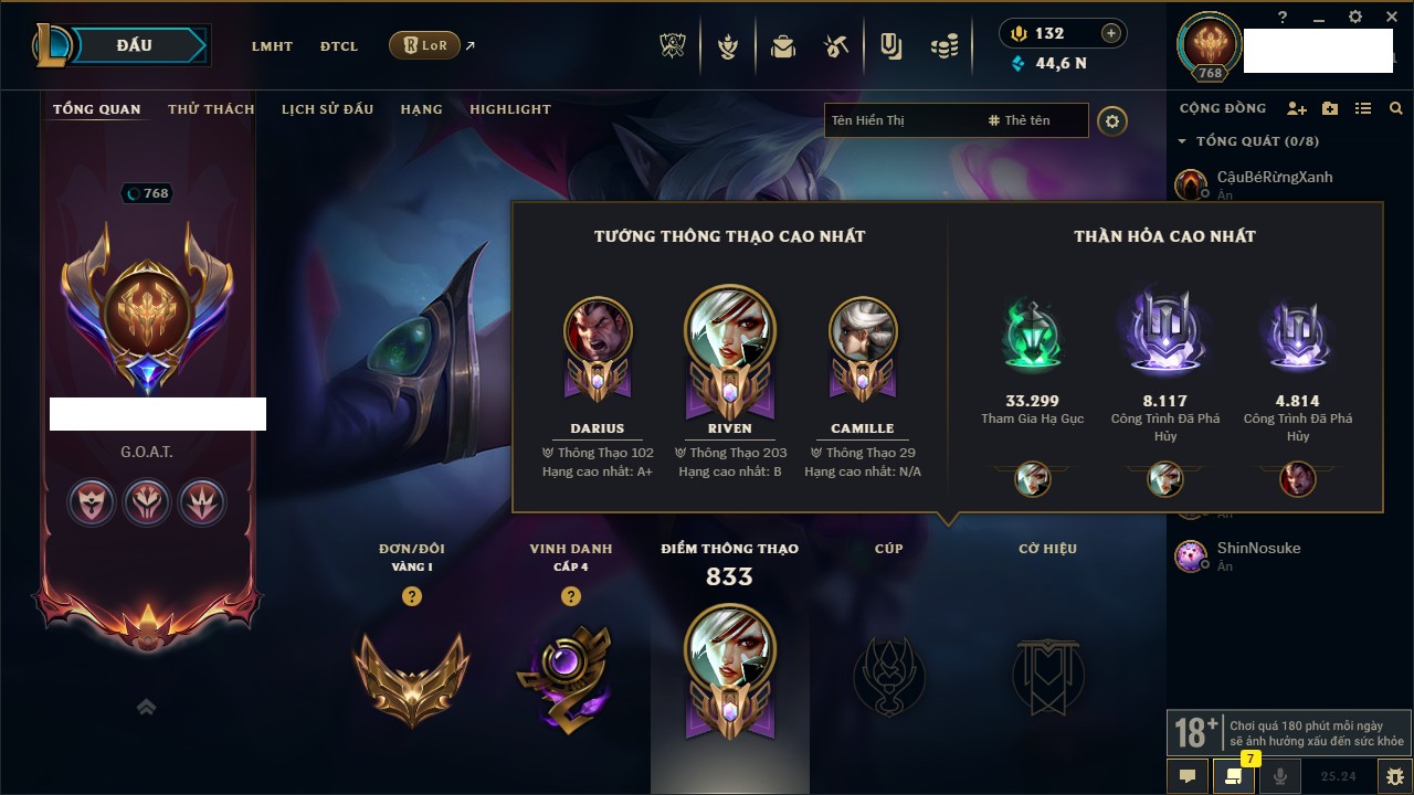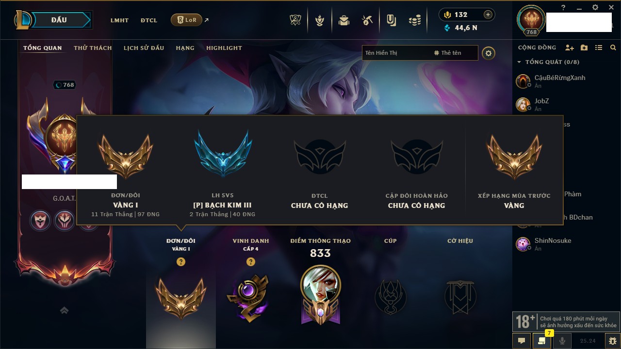 Rank Đơn: Chưa RankKhung: Bạch kimTướng: 172 - Còn 59200 THXTrang Phục: 471Rank ĐTCL: Bạch Kim IIILinh Thú: 114