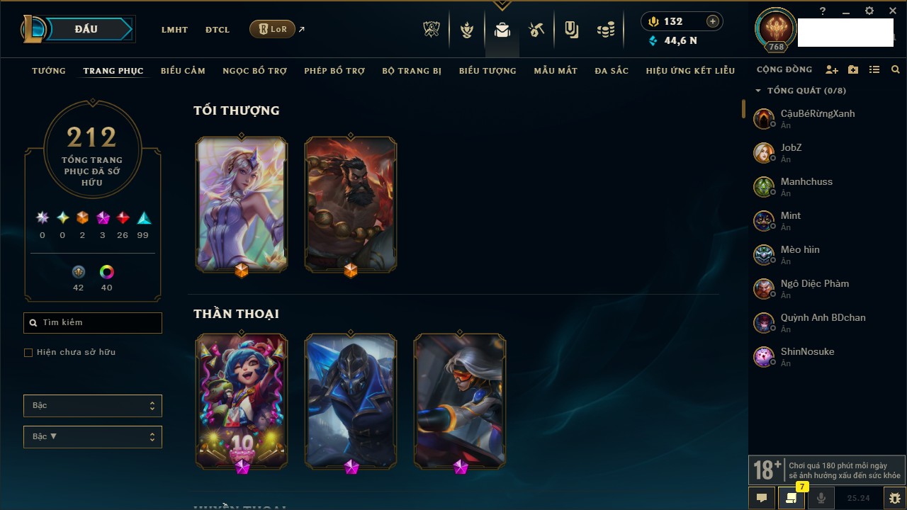 Rank Đơn: Chưa RankKhung: Chưa có khungTướng: 169 - Còn 43188 THXTrang Phục: 205Rank ĐTCL: Chưa RankLinh Thú: 259