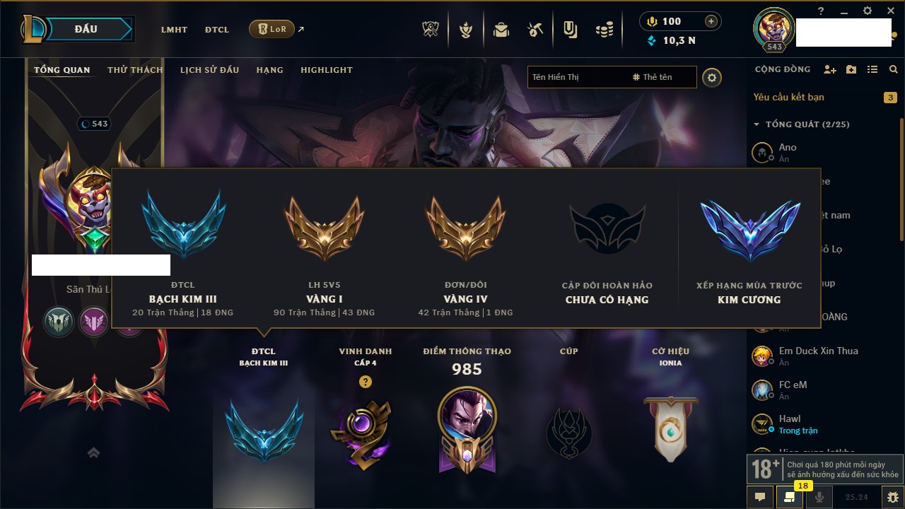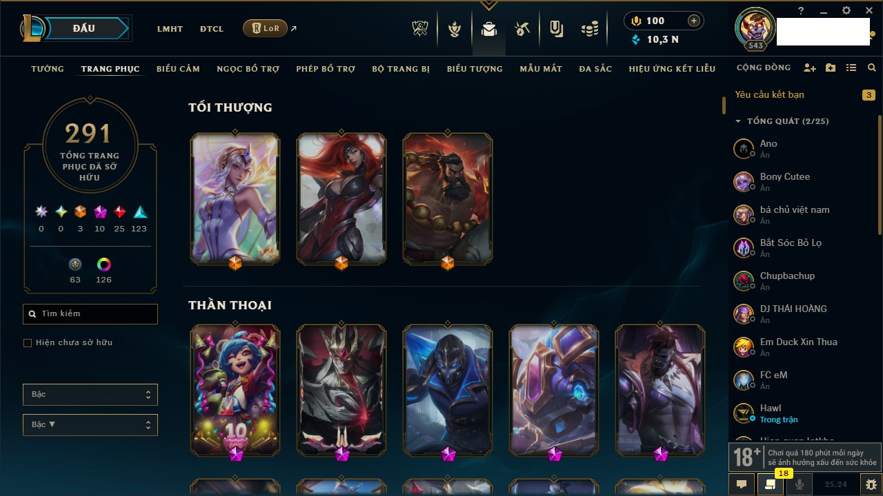 Rank Đơn: Chưa RankKhung: Chưa có khungTướng: 171 - Còn 827961 THXTrang Phục: 193Rank ĐTCL: Chưa RankLinh Thú: 63