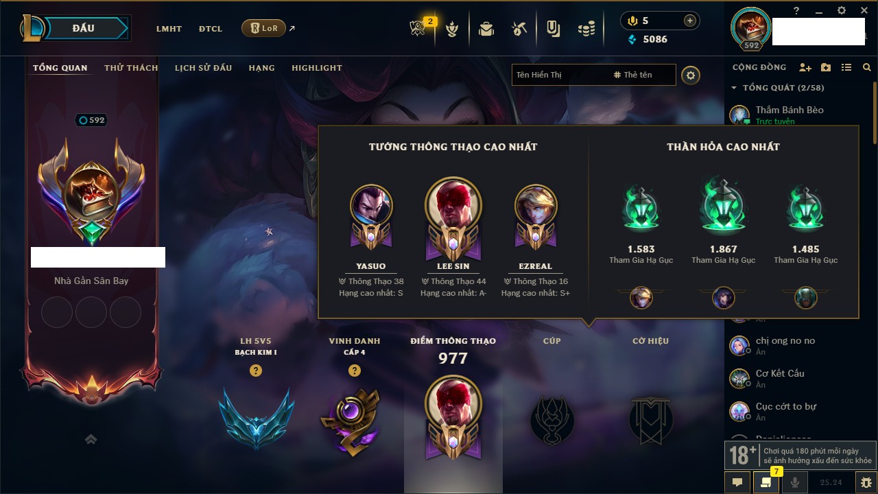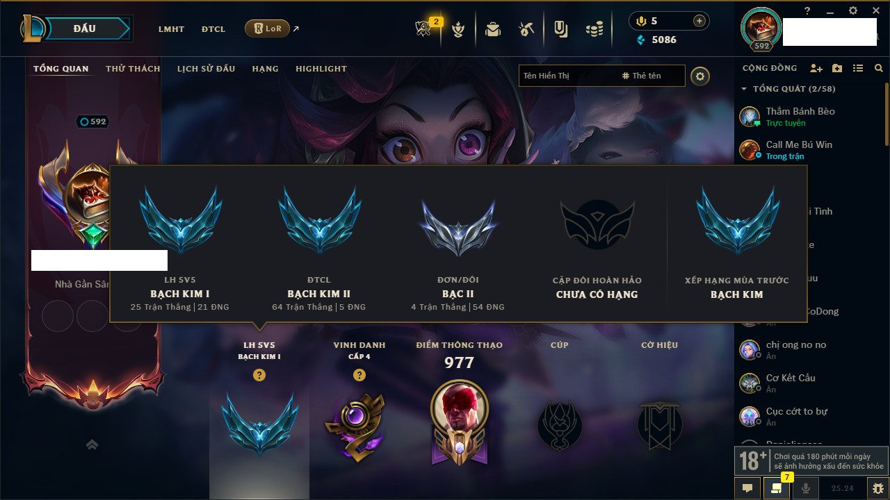Rank Đơn: Chưa Rank Khung: Bạch kim Tướng: 170 - Còn 95523 THX Trang Phục: 243 Rank ĐTCL: Chưa Rank Linh Thú: 150