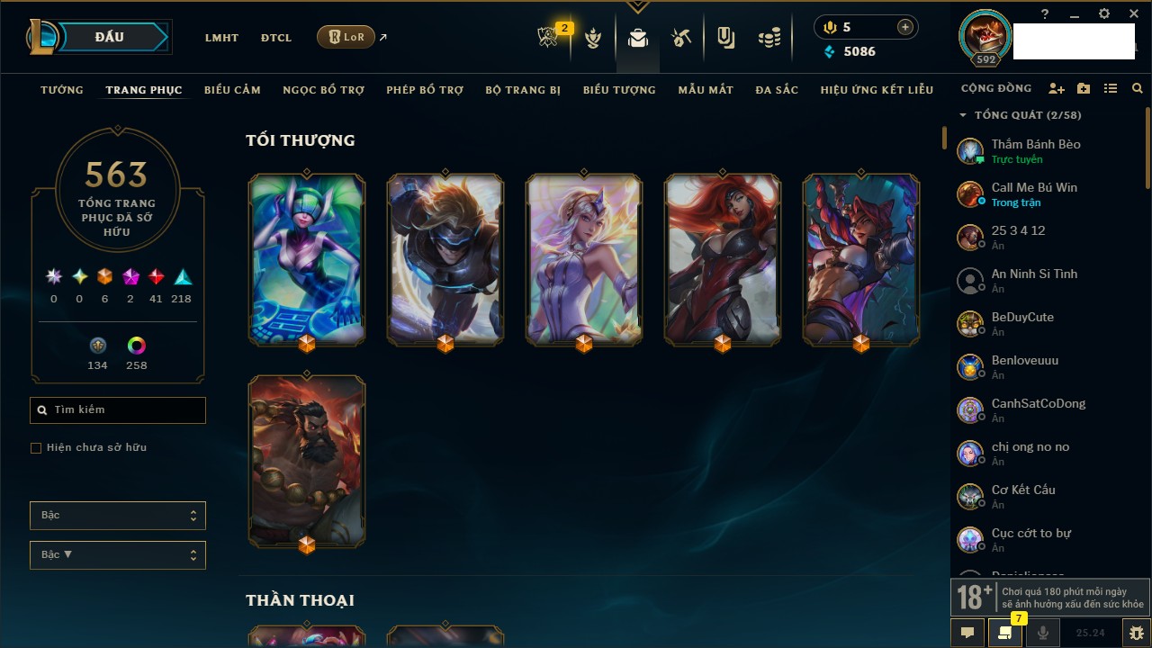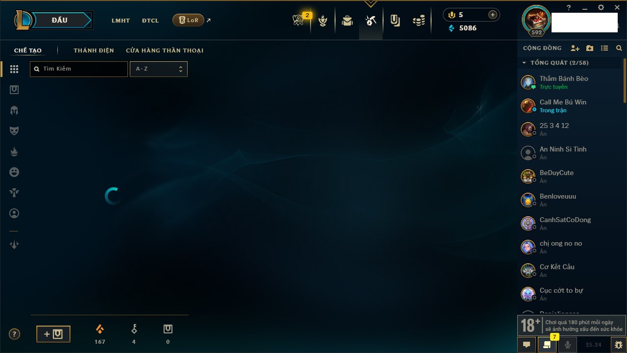 Rank Đơn: Chưa Rank Khung: Chưa có khung Tướng: 172 - Còn 5086 THX Trang Phục: 563 Rank ĐTCL: Chưa Rank Linh Thú: 153