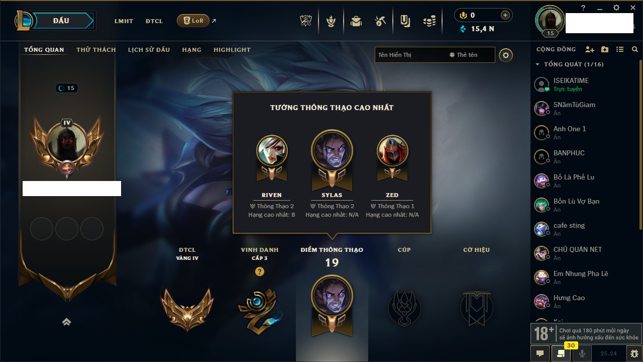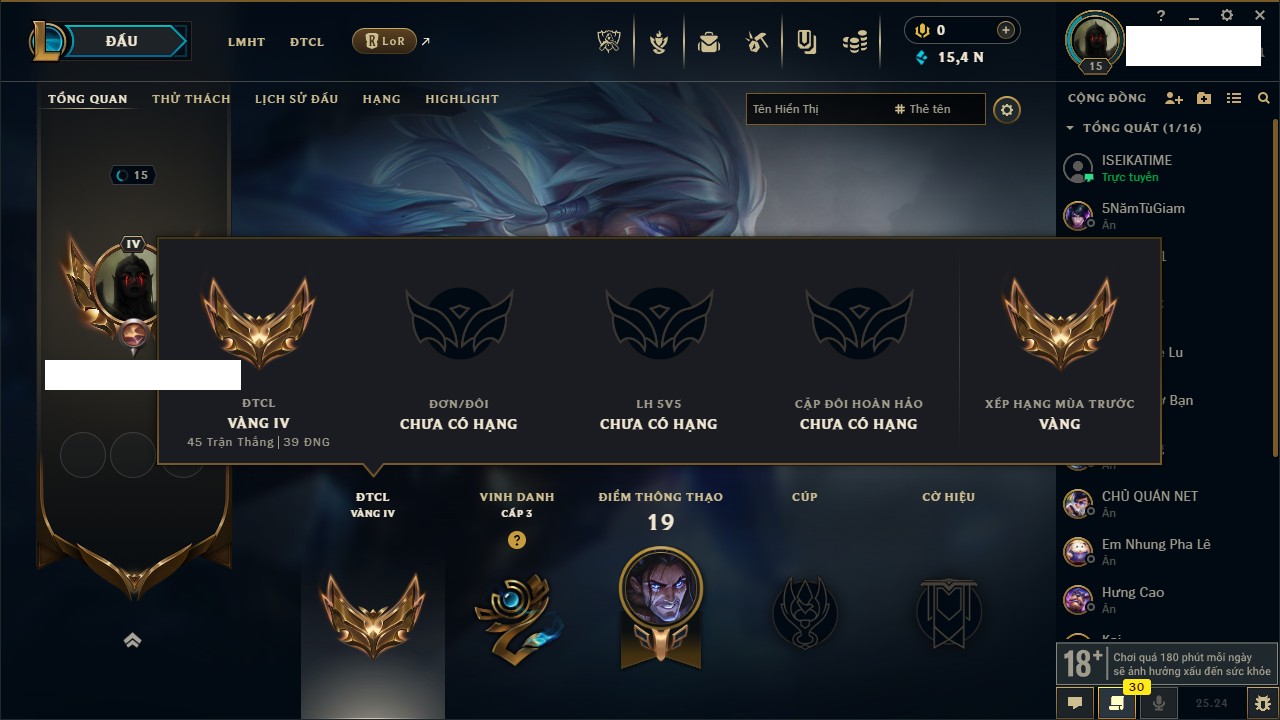 Rank Đơn: Chưa RankKhung: Chưa có khungTướng: 27 - Còn 170 THXTrang Phục: 0Rank ĐTCL: Chưa RankLinh Thú: 33