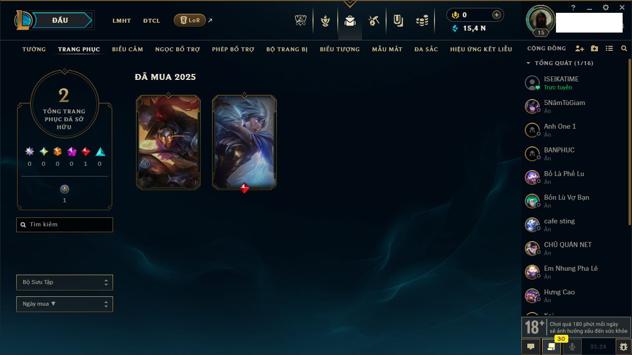 Rank Đơn: Chưa RankKhung: Chưa có khungTướng: 42 - Còn 15455 THXTrang Phục: 2Rank ĐTCL: Chưa RankLinh Thú: 25