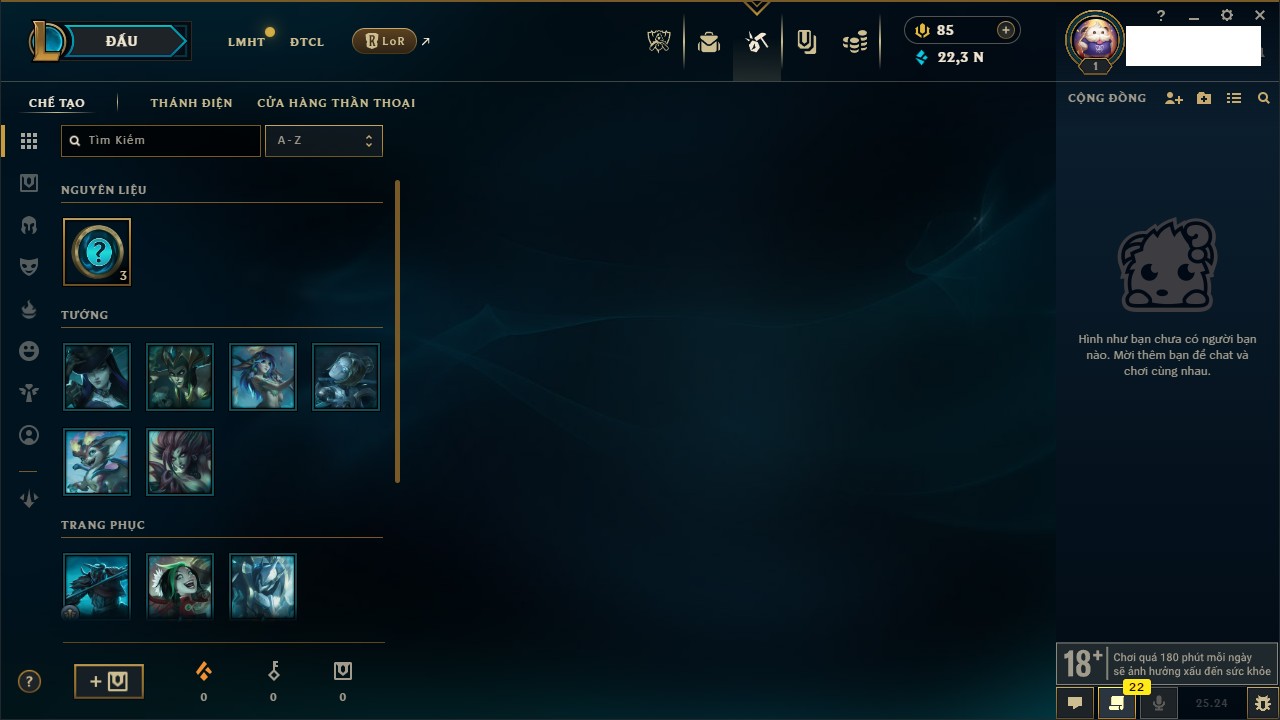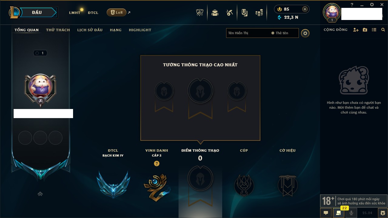 Rank Đơn: Chưa RankKhung: Bạch kimTướng: 171 - Còn 182788 THXTrang Phục: 158Rank ĐTCL: Chưa RankLinh Thú: 56