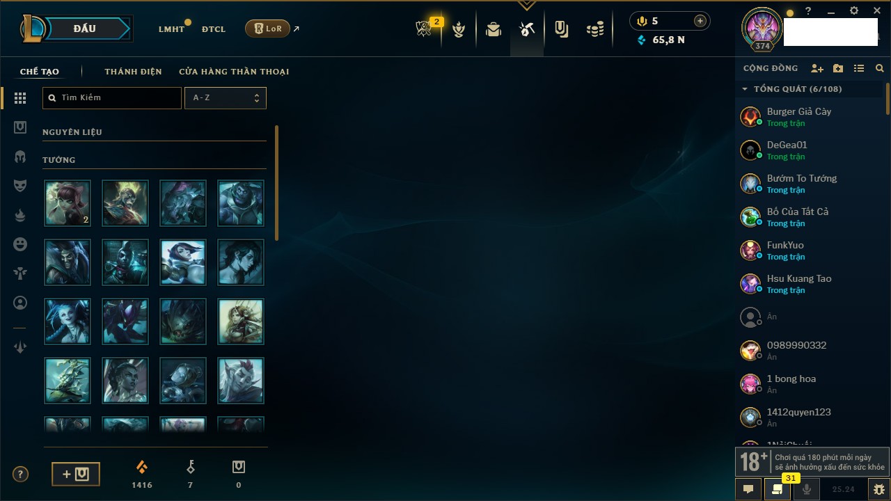 Rank Đơn: Lục Bảo IVKhung: Lục BảoTướng: 172 - Còn 70498 THXTrang Phục: 245Rank ĐTCL: Đồng IIILinh Thú: 145