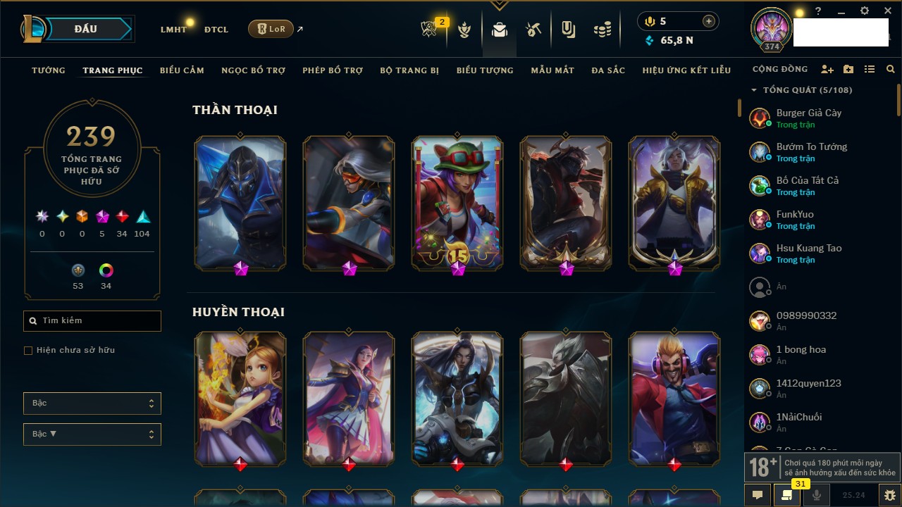 Rank Đơn: Bạc IIKhung: VàngTướng: 171 - Còn 48568 THXTrang Phục: 121Rank ĐTCL: Chưa RankLinh Thú: 30