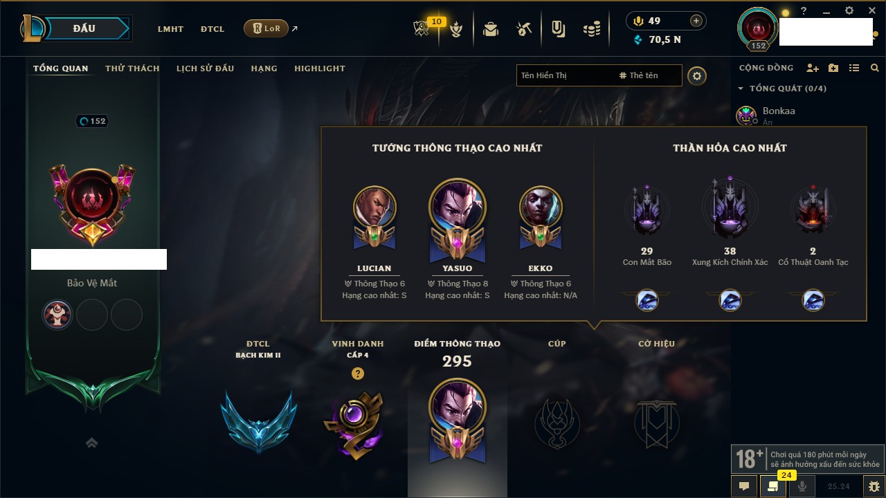 Rank Đơn: Chưa rank mùa nào Khung: Chưa có khung Tướng: 30 - Còn 5140 THX Trang Phục: 3 Rank ĐTCL: Bạch Kim IV Linh Thú: 221