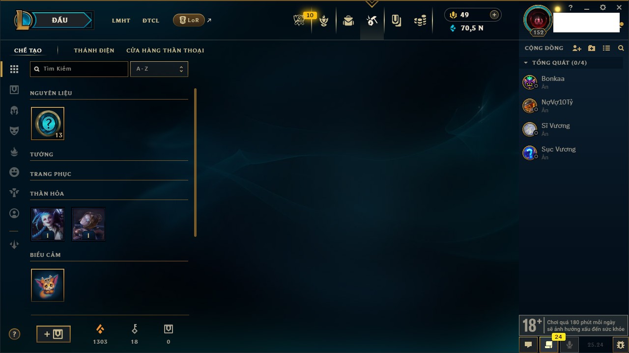 Rank Đơn: Chưa Rank Khung: Chưa có khung Tướng: 170 - Còn 40111 THX Trang Phục: 679 Rank ĐTCL: Chưa Rank Linh Thú: 216