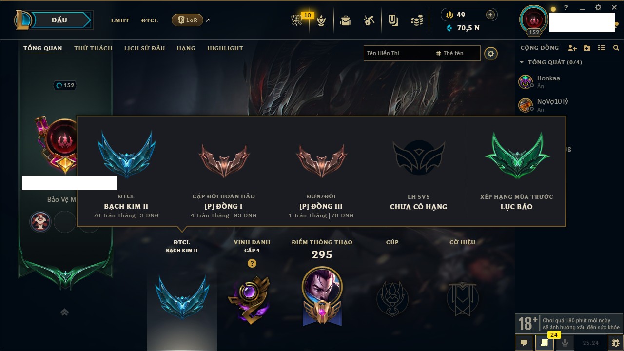 Rank Đơn: Chưa Rank Khung: Bạch kim Tướng: 170 - Còn 73280 THX Trang Phục: 577 Rank ĐTCL: Chưa Rank Linh Thú: 84