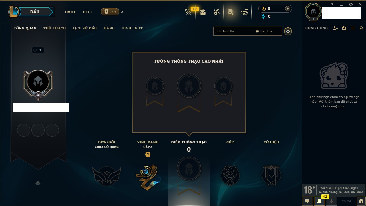 Rank Đơn: Chưa rank mùa nào Khung: Chưa có khung Tướng: 30 - Còn 5140 THX Trang Phục: 3 Rank ĐTCL: Bạch Kim IV Linh Thú: 221