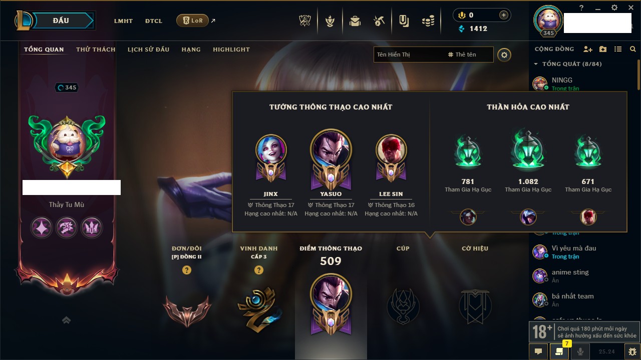 Rank Đơn: Chưa RankKhung: Chưa có khungTướng: 158 - Còn 1412 THXTrang Phục: 152Rank ĐTCL: Chưa RankLinh Thú: 69