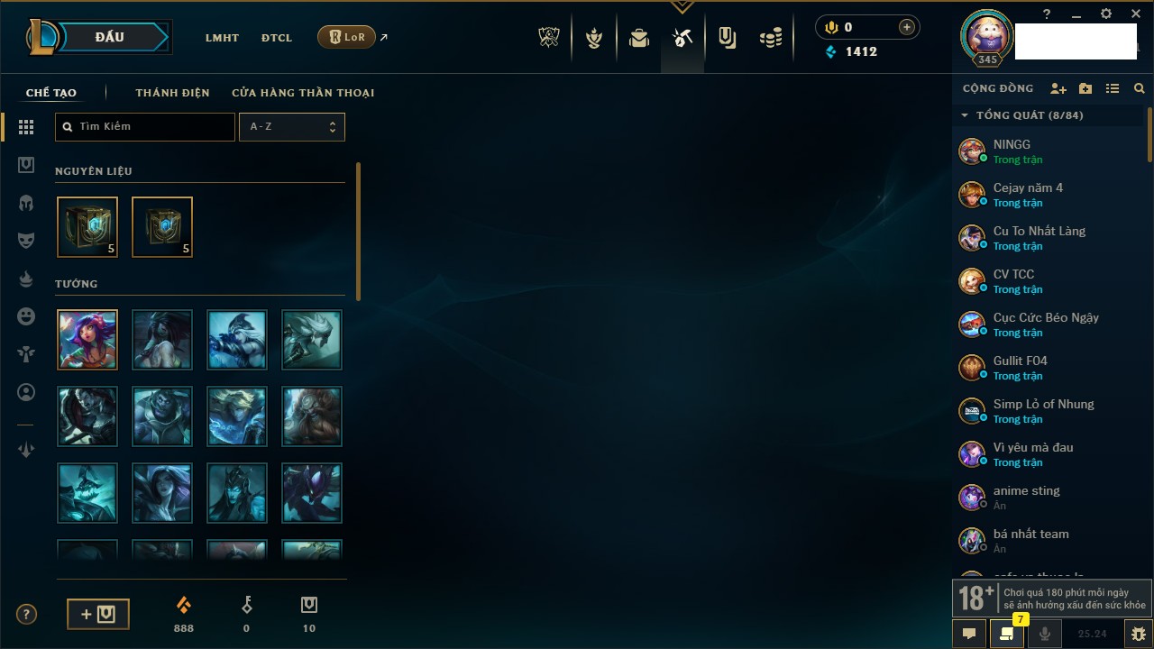 Rank Đơn: Chưa RankKhung: Chưa có khungTướng: 171 - Còn 164047 THXTrang Phục: 173Rank ĐTCL: Chưa RankLinh Thú: 77