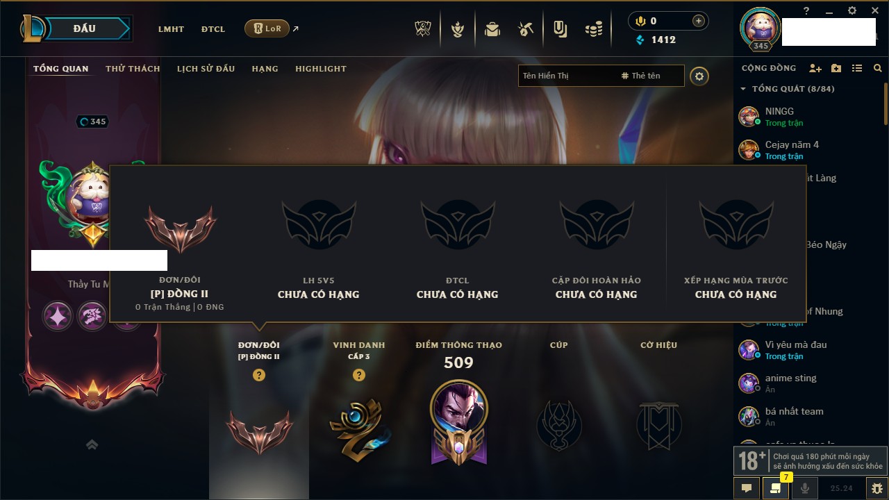 Rank Đơn: Đồng IIKhung: BạcTướng: 163 - Còn 491 THXTrang Phục: 221Rank ĐTCL: Chưa RankLinh Thú: 23