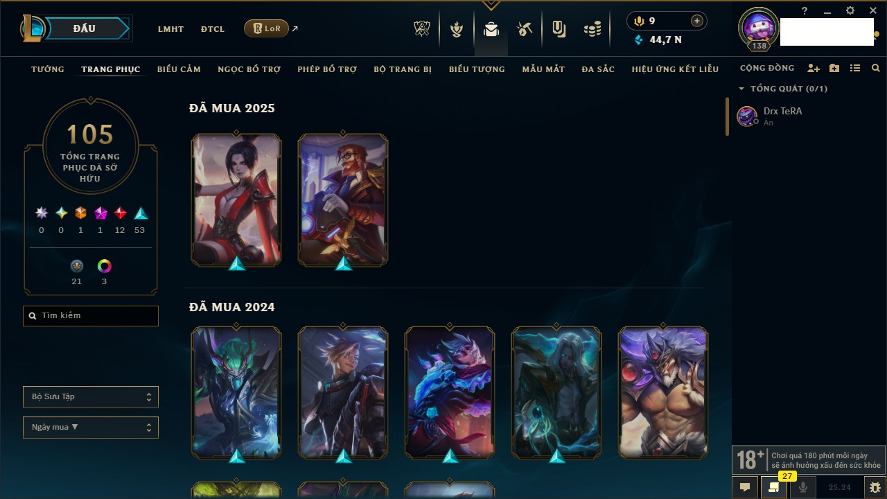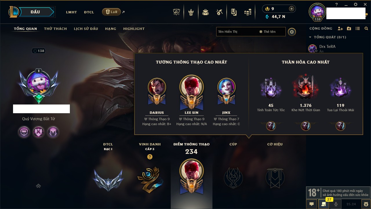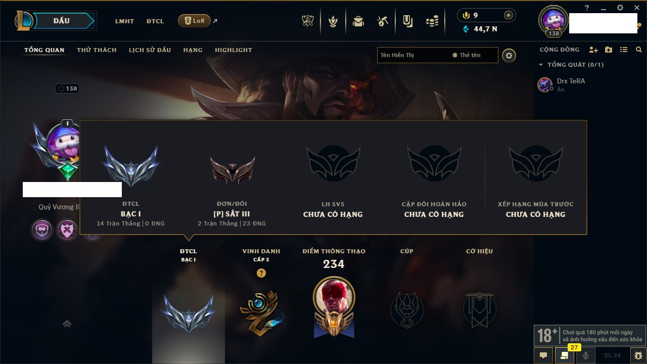 Rank Đơn: Chưa RankKhung: Bạch kimTướng: 171 - Còn 182788 THXTrang Phục: 158Rank ĐTCL: Chưa RankLinh Thú: 56