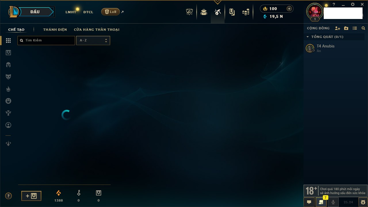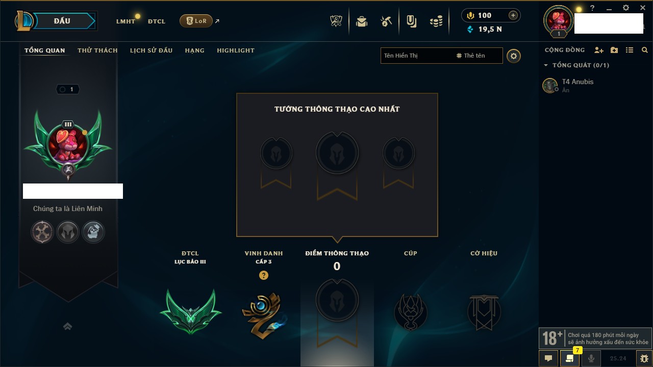 Rank Đơn: Chưa RankKhung: Bạch kimTướng: 172 - Còn 11167 THXTrang Phục: 460Rank ĐTCL: Chưa RankLinh Thú: 93