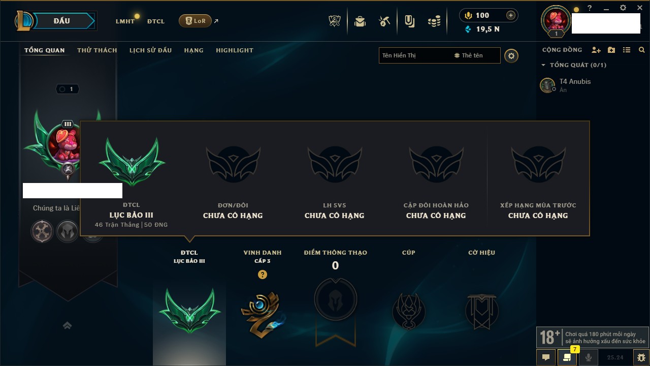 Rank Đơn: Chưa RankKhung: Chưa có khungTướng: 32 - Còn 16895 THXTrang Phục: 5Rank ĐTCL: Chưa RankLinh Thú: 70