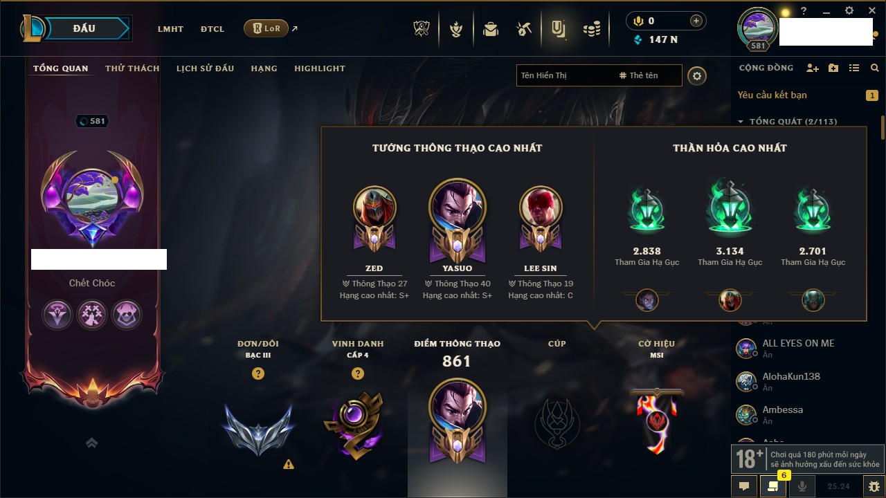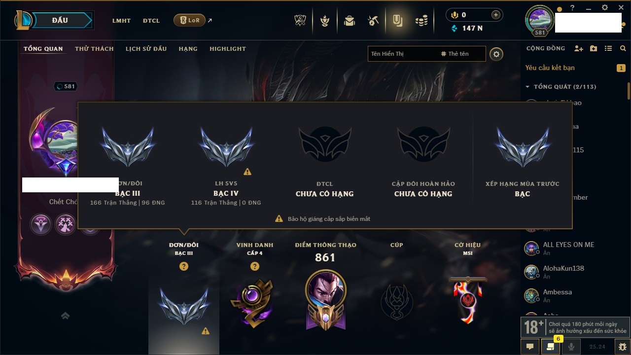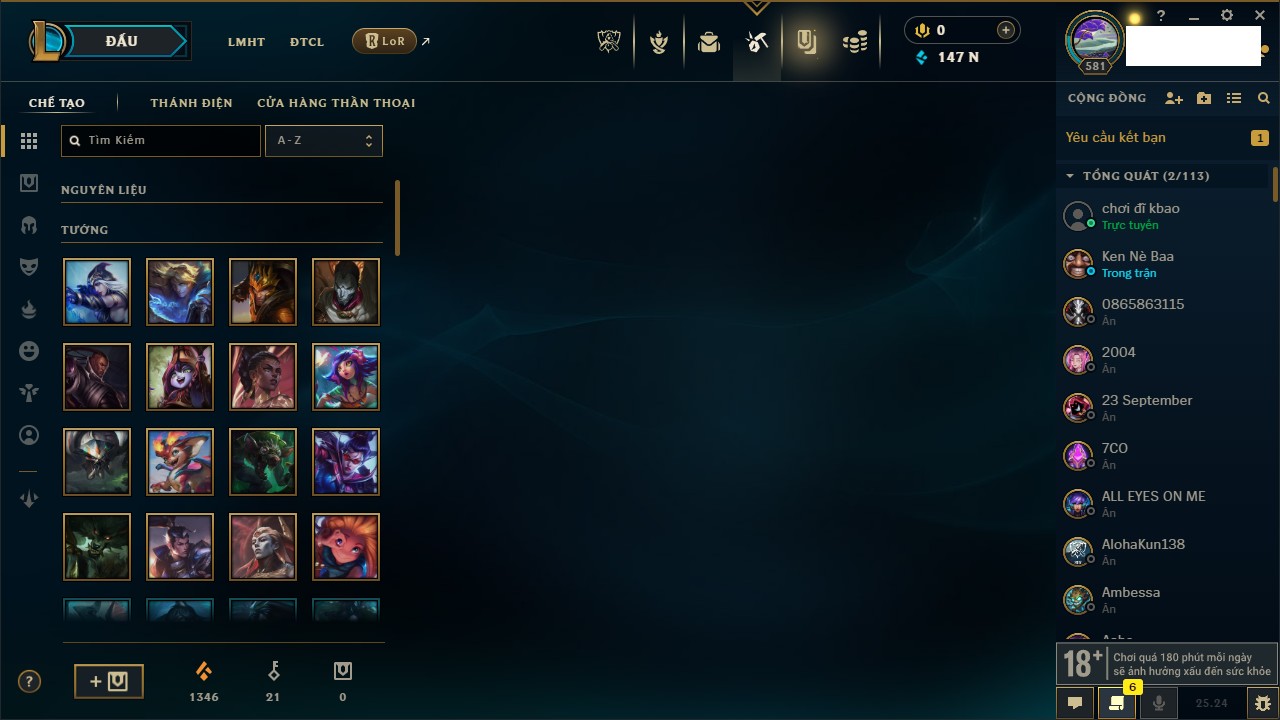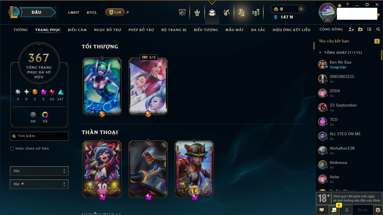 Rank Đơn: Chưa RankKhung: Bạch kimTướng: 171 - Còn 182788 THXTrang Phục: 158Rank ĐTCL: Chưa RankLinh Thú: 56