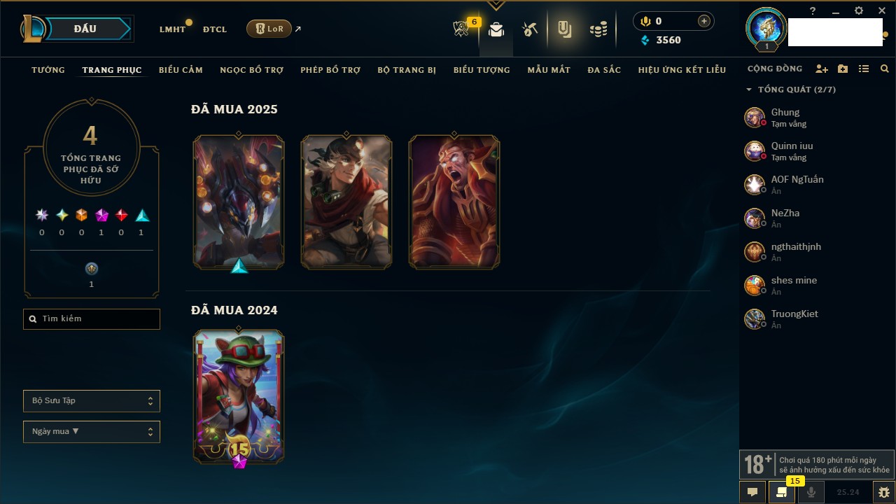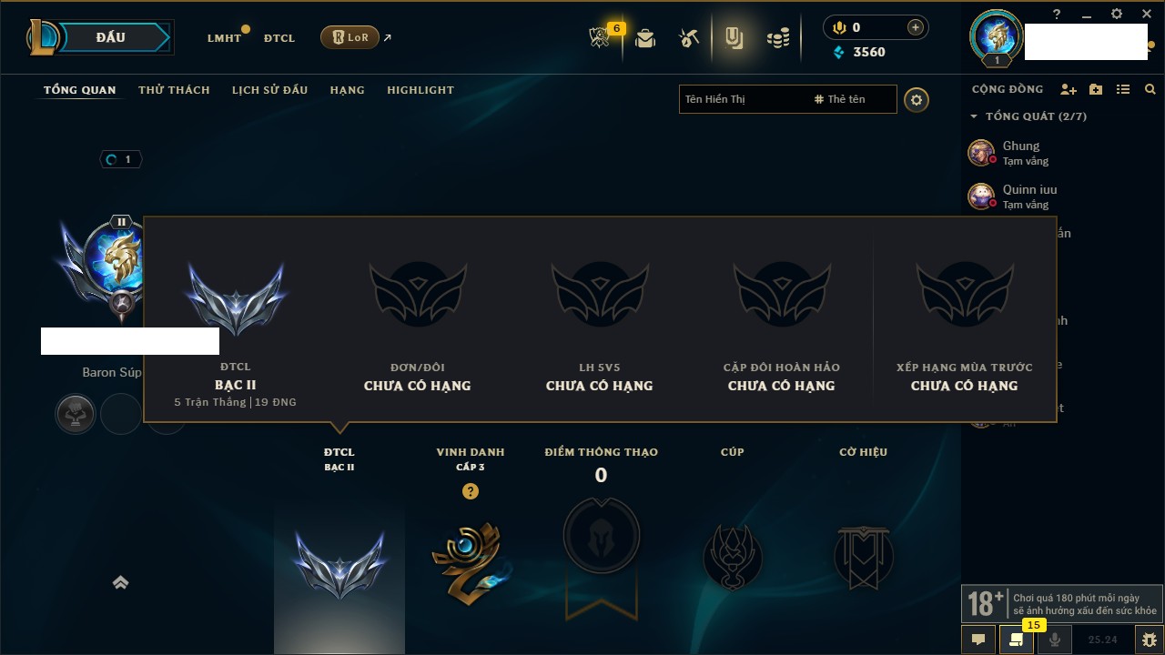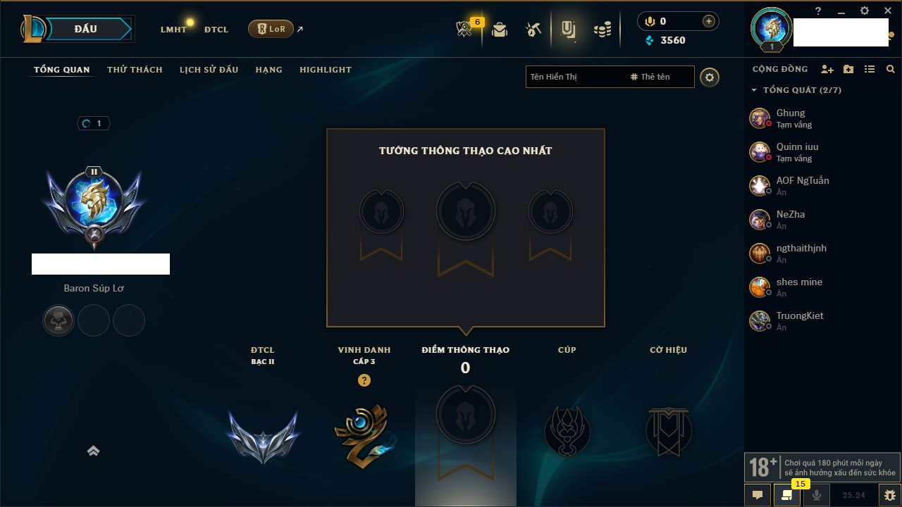 Rank Đơn: Chưa RankKhung: Bạch kimTướng: 172 - Còn 81 THXTrang Phục: 226Rank ĐTCL: Chưa RankLinh Thú: 193