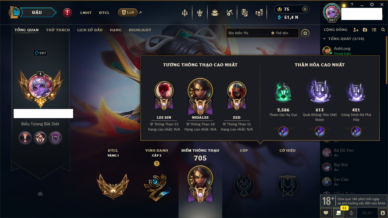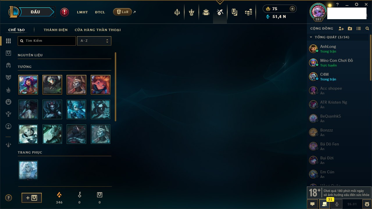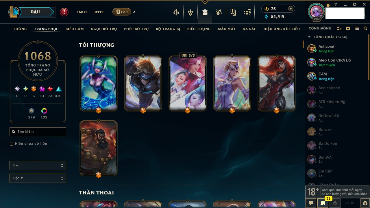 Rank Đơn: Chưa RankKhung: Chưa có khungTướng: 167 - Còn 65135 THXTrang Phục: 1316Rank ĐTCL: Chưa RankLinh Thú: 702