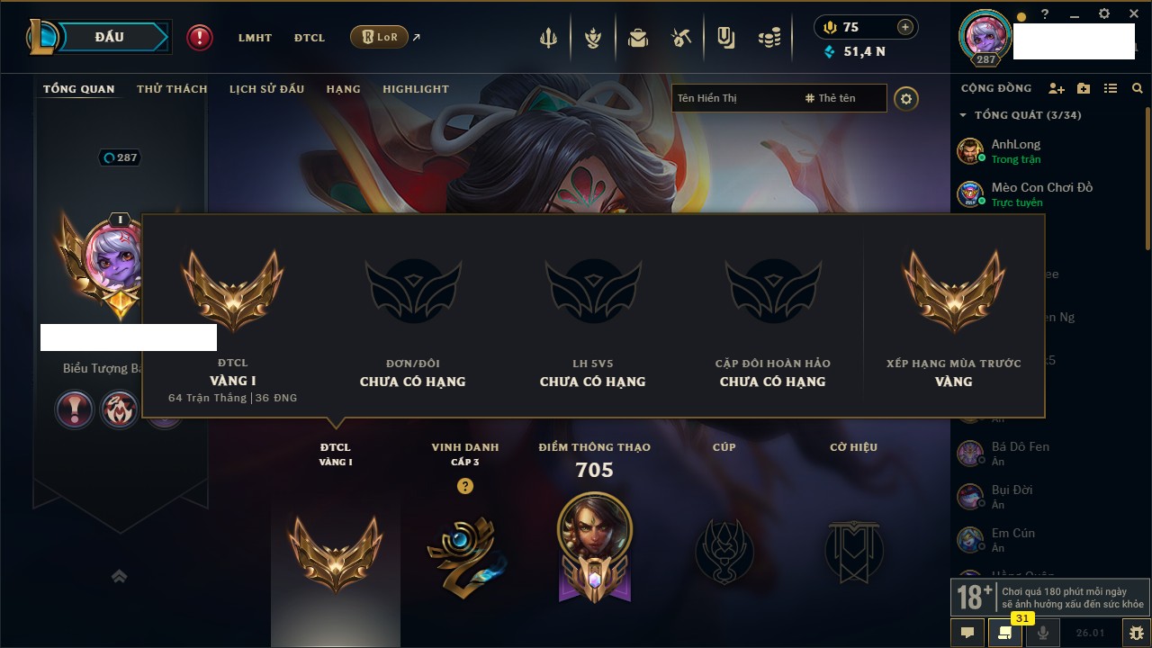 Rank Đơn: Chưa RankKhung: BạcTướng: 172 - Còn 51433 THXTrang Phục: 1068Rank ĐTCL: Vàng ILinh Thú: 404
