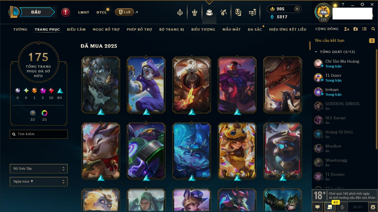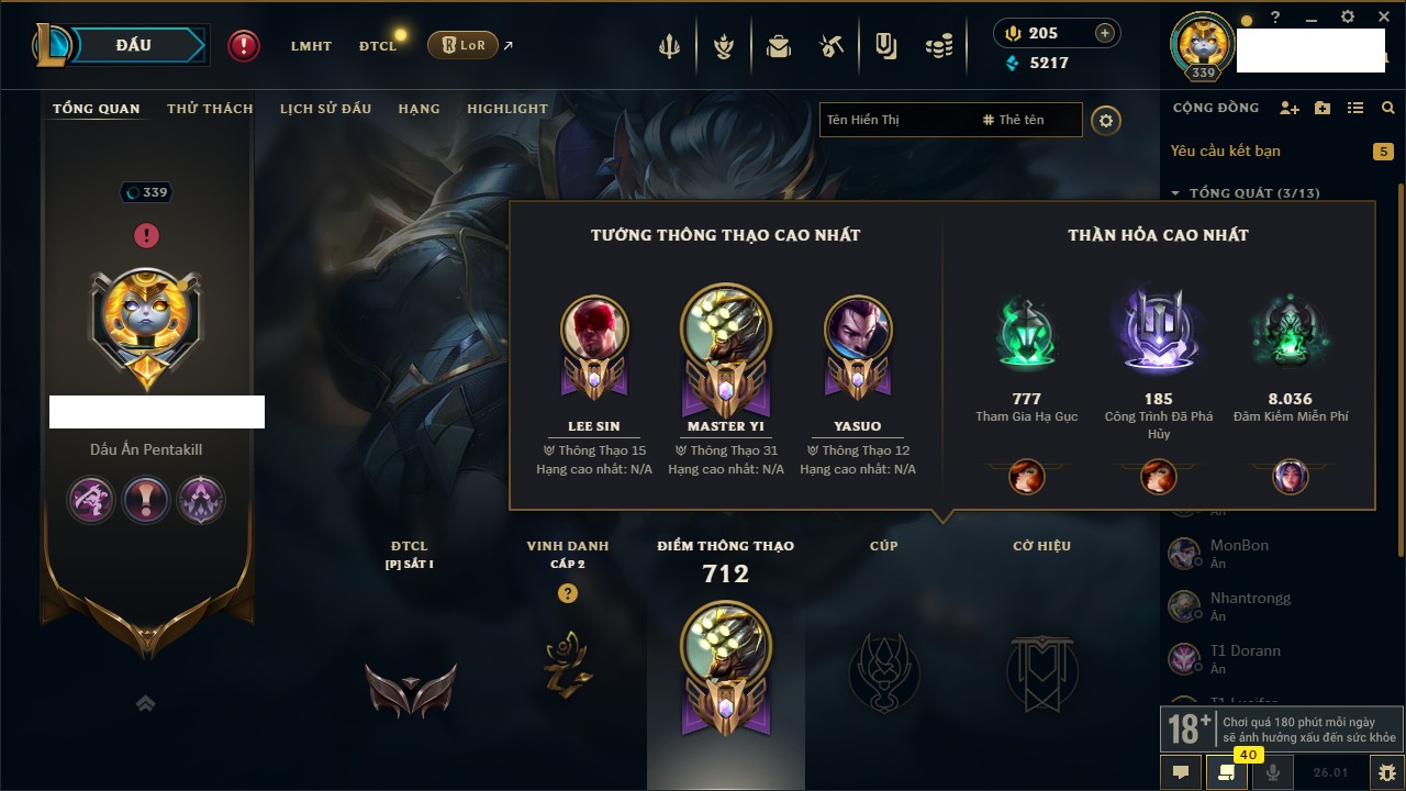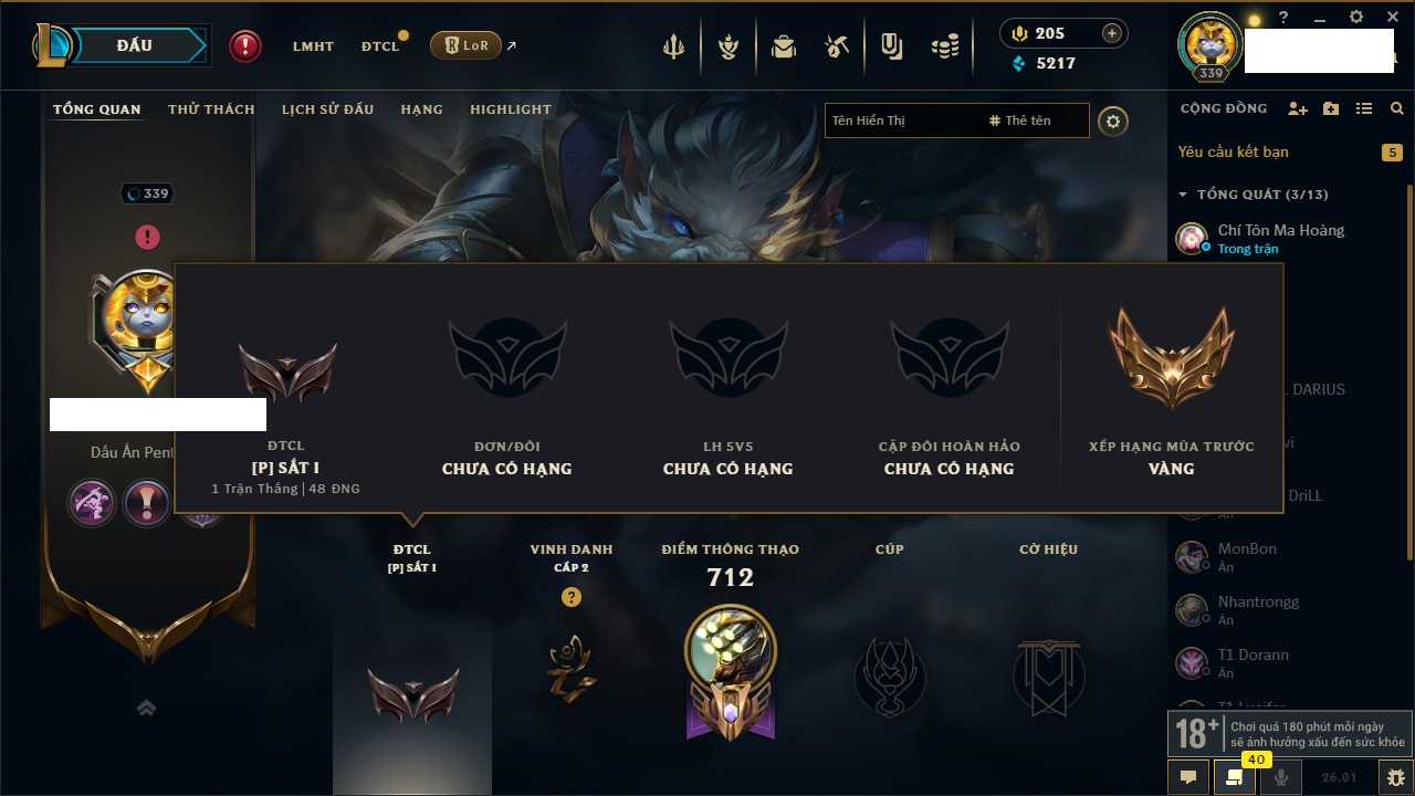 Rank Đơn: Bạc IKhung: Chưa có khungTướng: 172 - Còn 189559 THXTrang Phục: 182Rank ĐTCL: Chưa RankLinh Thú: 96