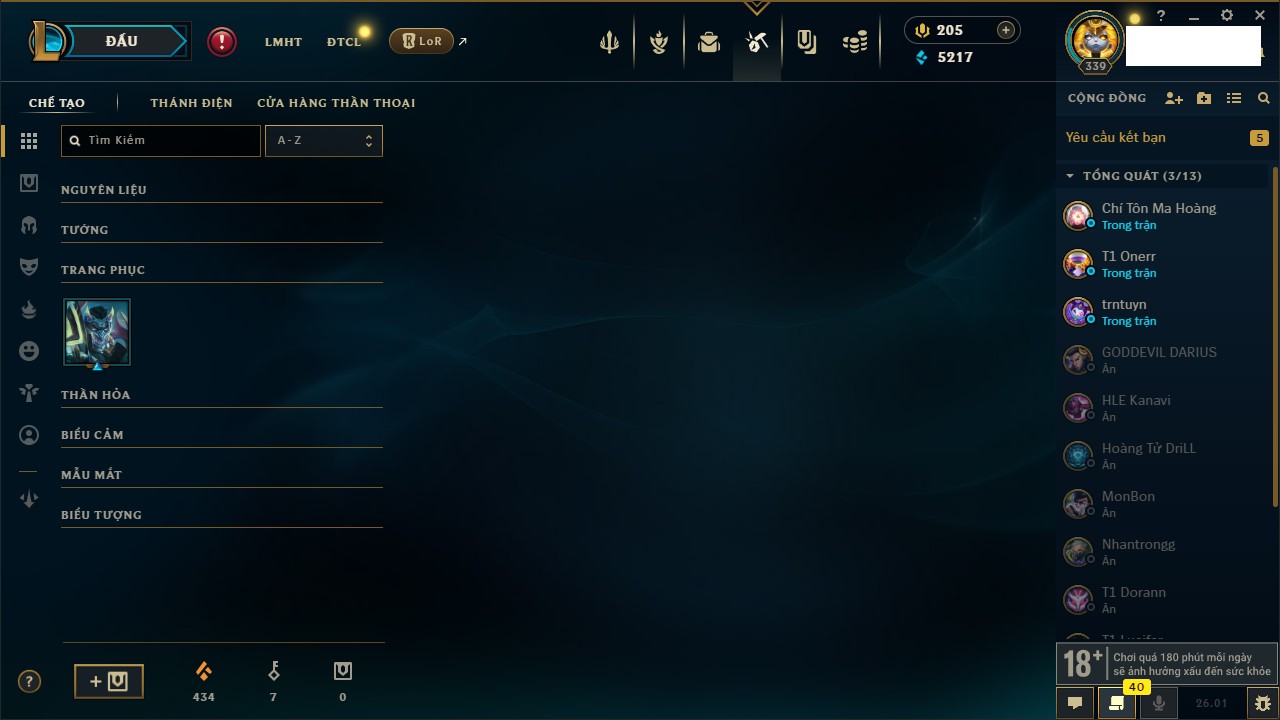Rank Đơn: Chưa RankKhung: BạcTướng: 171 - Còn 101359 THXTrang Phục: 88Rank ĐTCL: Chưa RankLinh Thú: 200