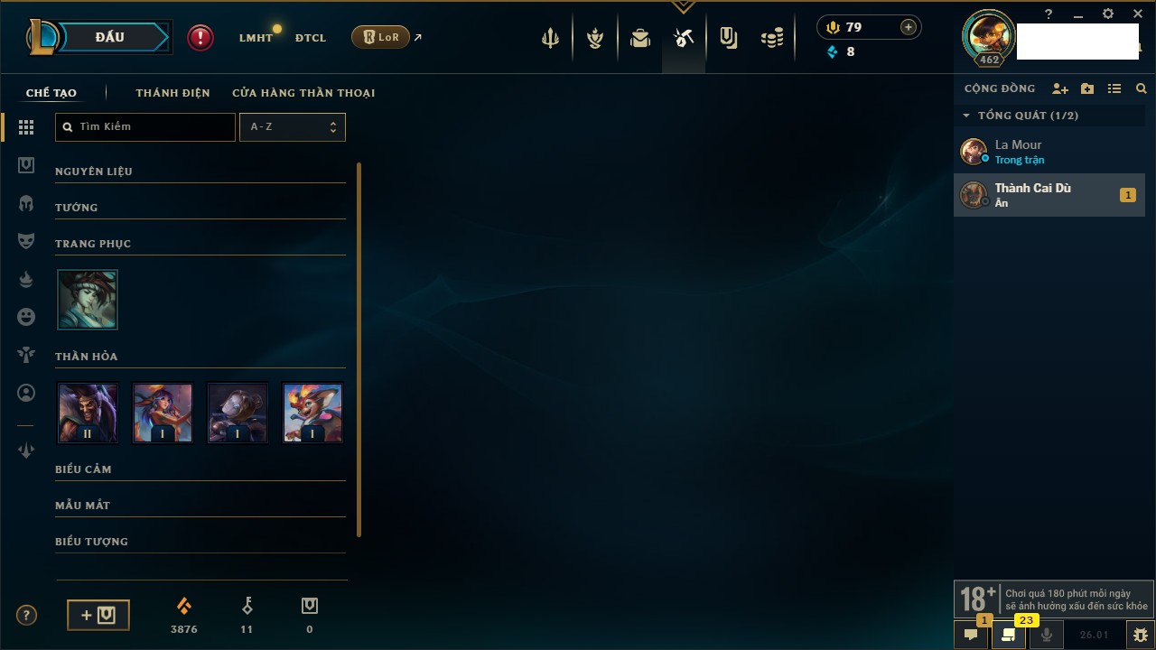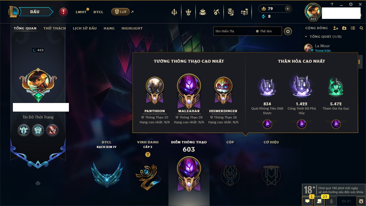 Rank Đơn: Chưa RankKhung: Bạch kimTướng: 172 - Còn 59200 THXTrang Phục: 471Rank ĐTCL: Bạch Kim IIILinh Thú: 114