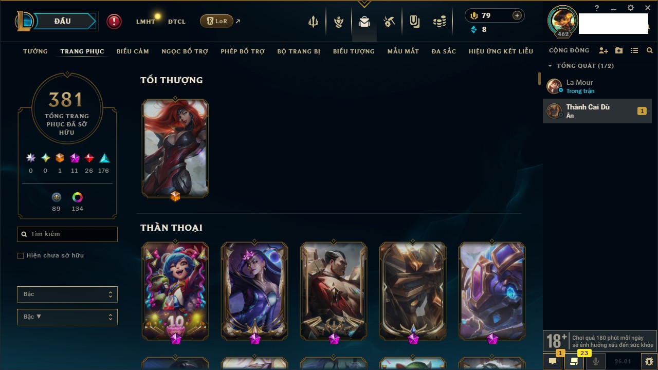 Rank Đơn: Chưa RankKhung: Chưa có khungTướng: 169 - Còn 43188 THXTrang Phục: 205Rank ĐTCL: Chưa RankLinh Thú: 259