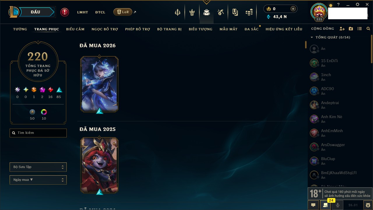 Rank Đơn: Chưa Rank Khung: Chưa có khung Tướng: 171 - Còn 52162 THX Trang Phục: 78 Rank ĐTCL: Chưa Rank Linh Thú: 145