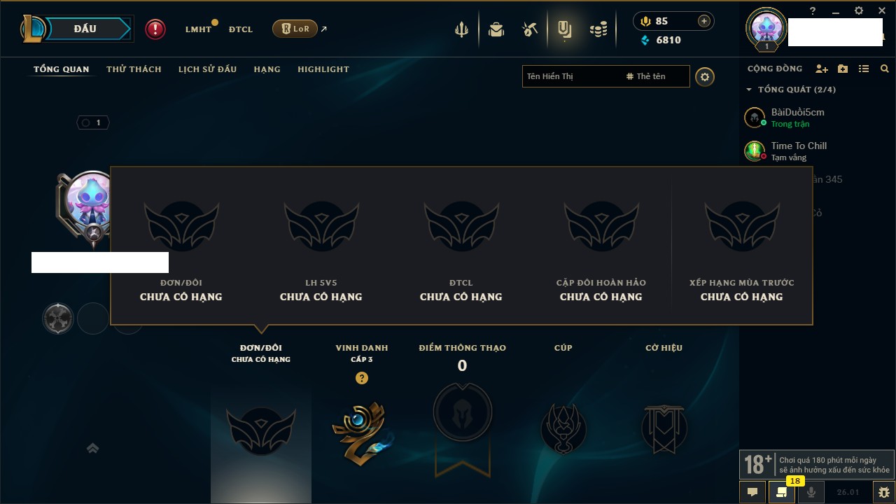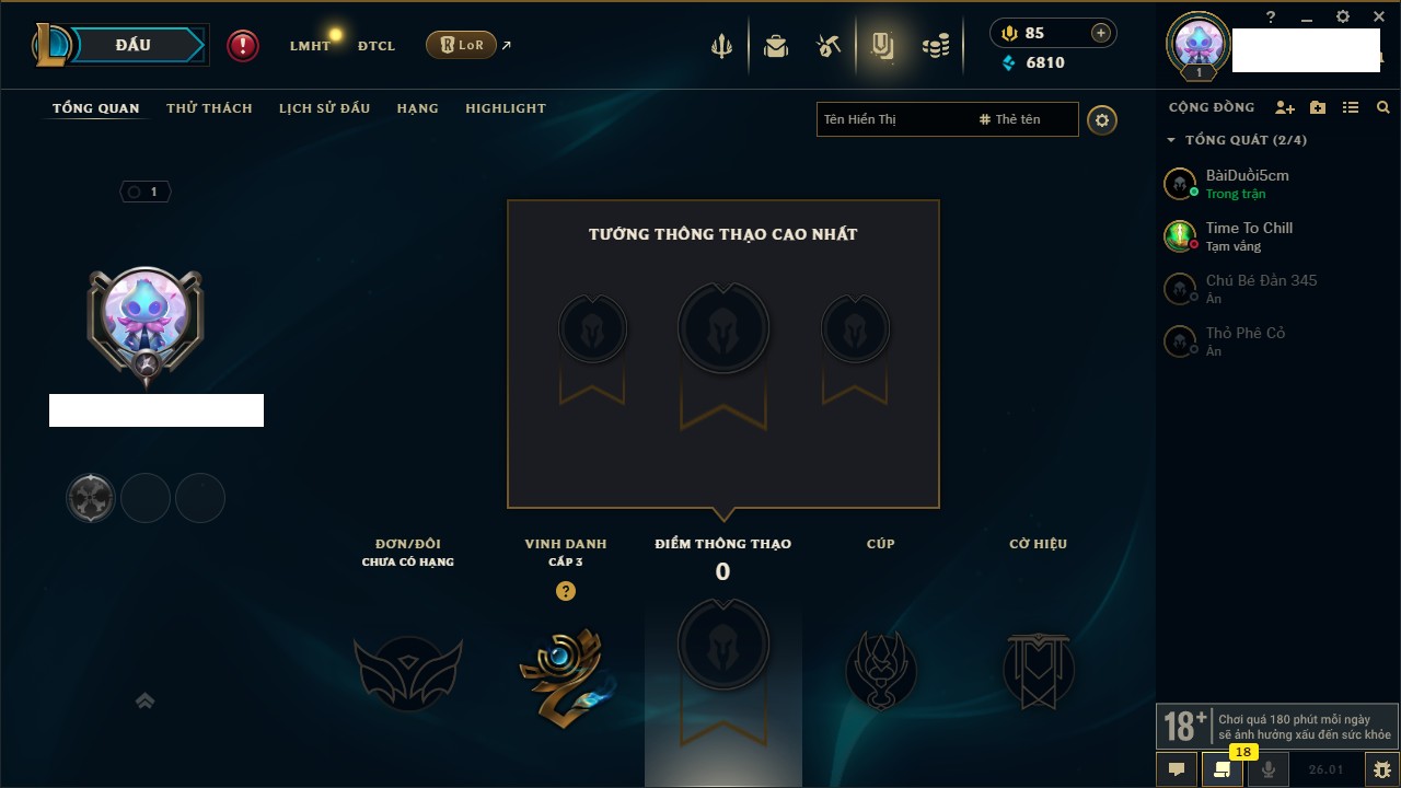 Rank Đơn: Chưa rank mùa nàoKhung: Chưa có khungTướng: 3 - Còn 6810 THXTrang Phục: 0Rank ĐTCL: Chưa RankLinh Thú: 41