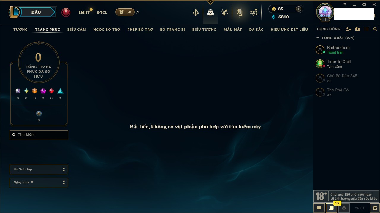 Rank Đơn: Chưa RankKhung: Chưa có khungTướng: 1 - Còn 6000 THXTrang Phục: 0Rank ĐTCL: Chưa RankLinh Thú: 9