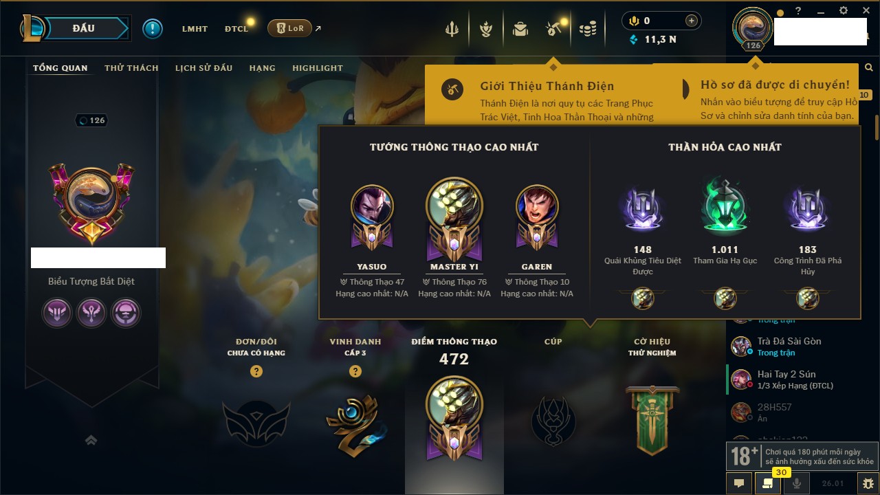 Rank Đơn: Chưa Rank Khung: Bạc Tướng: 84 - Còn 11948 THX Trang Phục: 23 Rank ĐTCL: Chưa Rank Linh Thú: 63