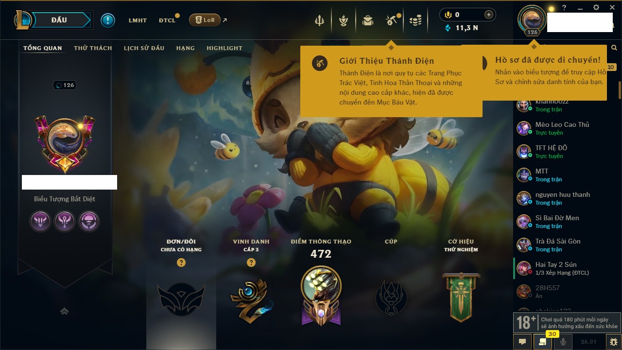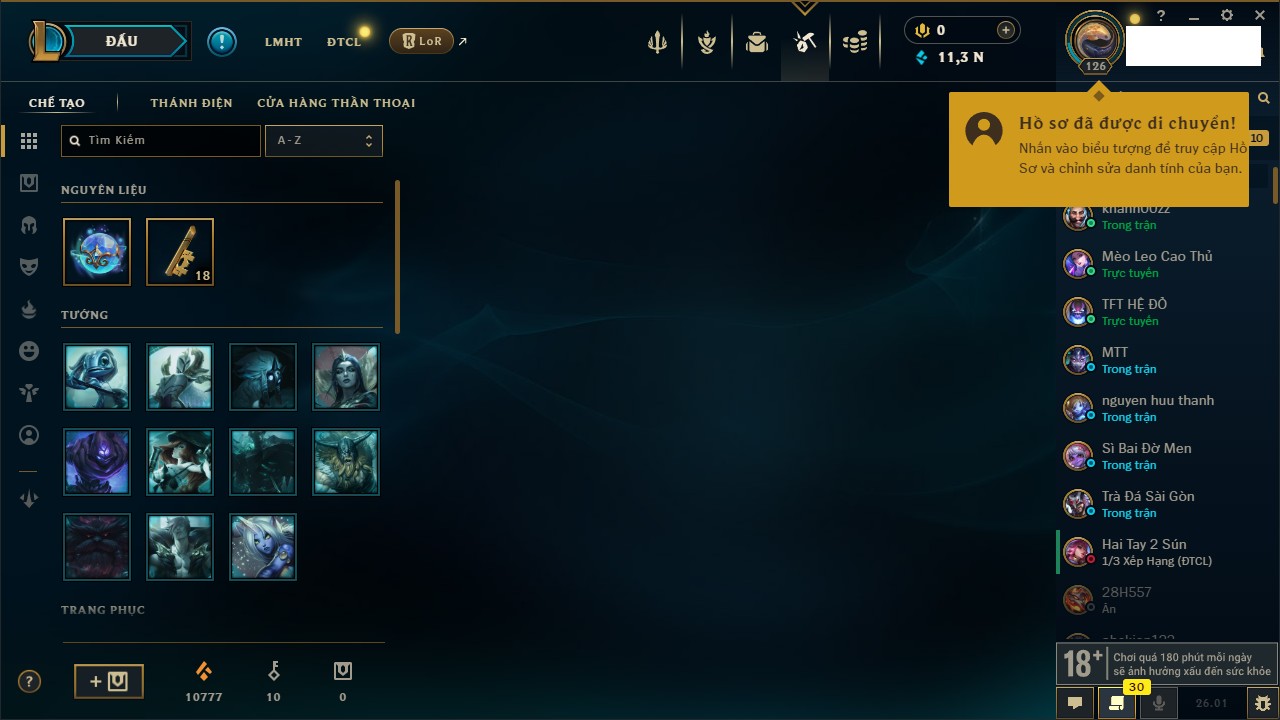Rank Đơn: Chưa Rank Khung: Chưa có khung Tướng: 171 - Còn 52162 THX Trang Phục: 78 Rank ĐTCL: Chưa Rank Linh Thú: 145