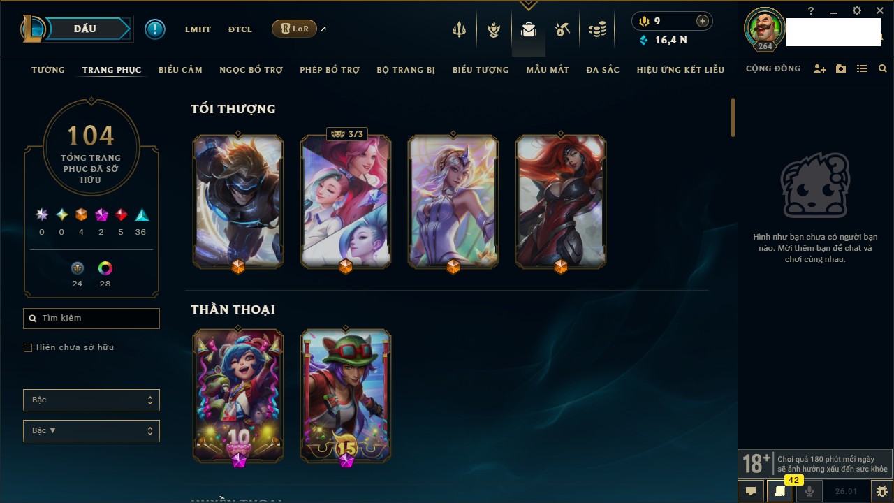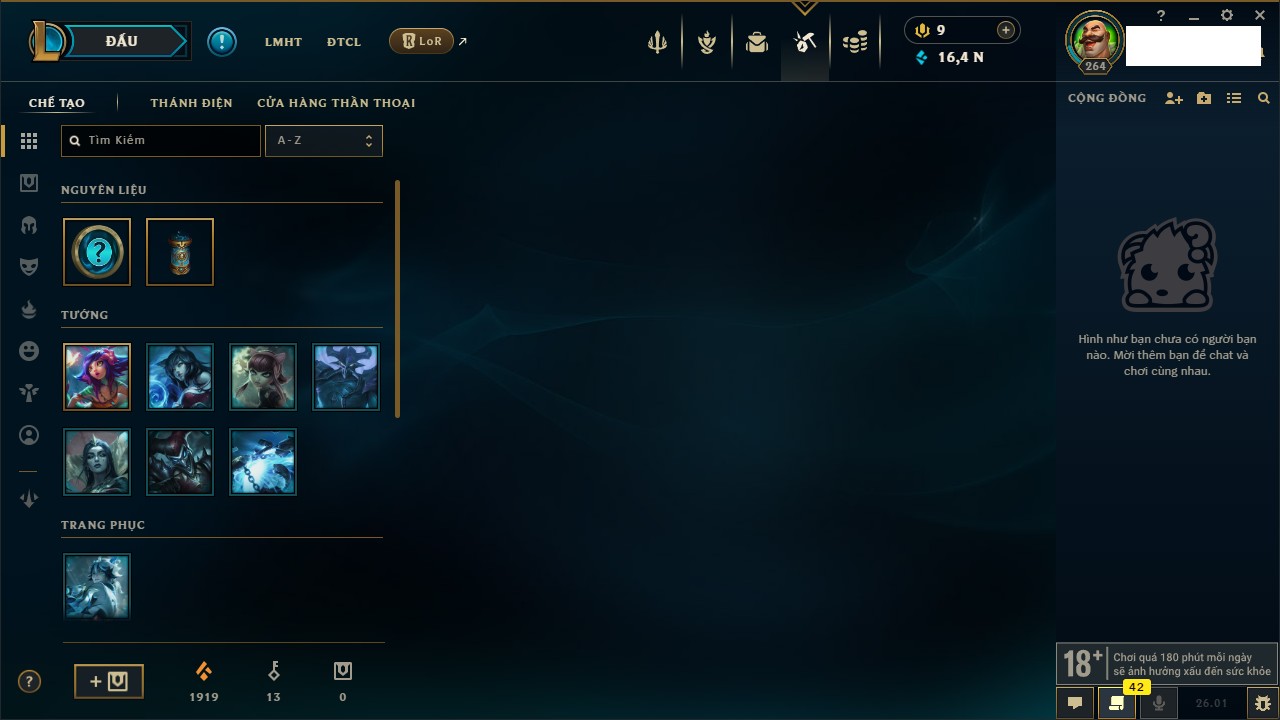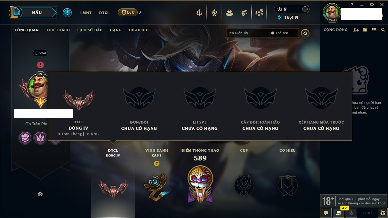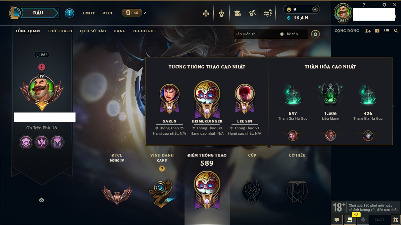 Rank Đơn: Đồng IKhung: Chưa có khungTướng: 130 - Còn 4038 THXTrang Phục: 151Rank ĐTCL: Chưa RankLinh Thú: 45