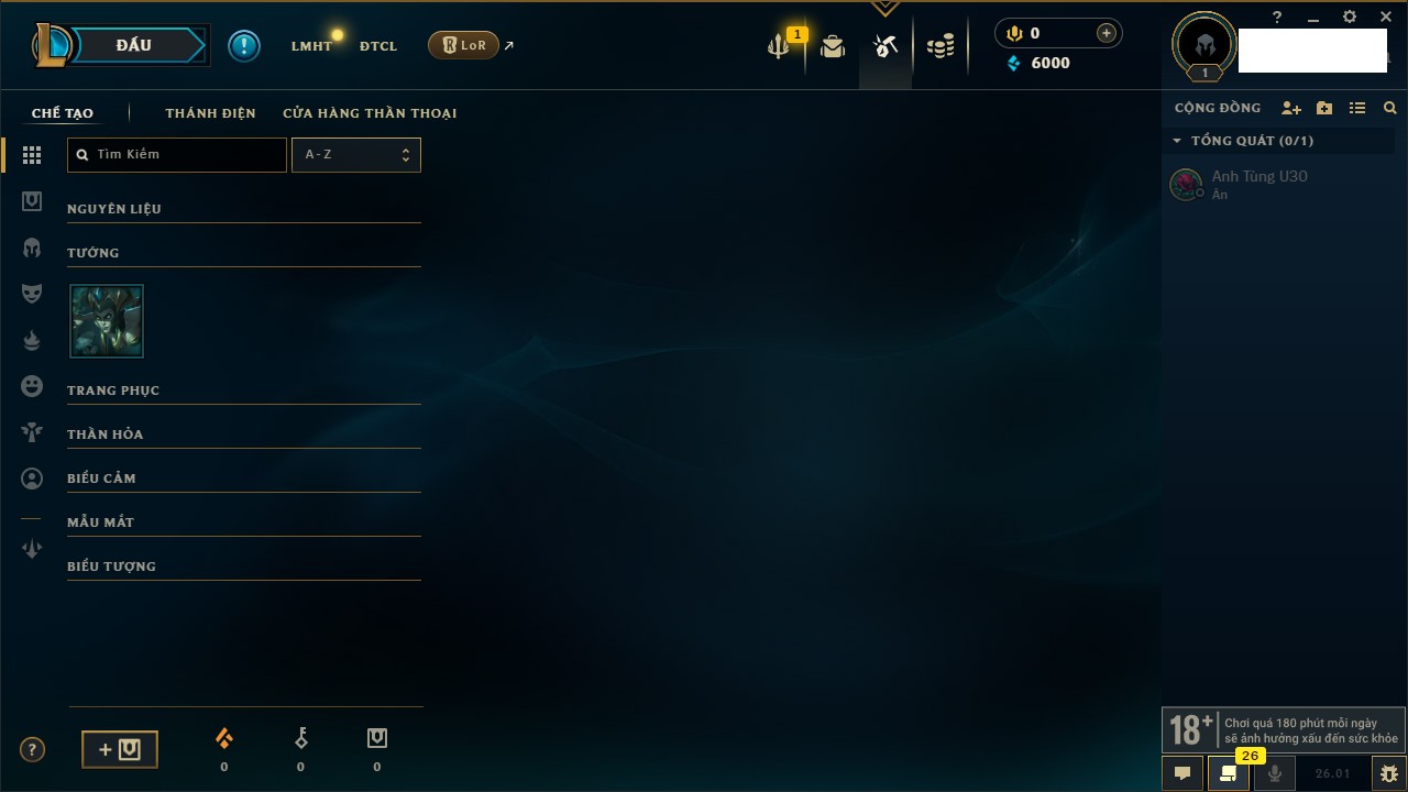 Rank Đơn: Chưa Rank Khung: Chưa có khung Tướng: 157 - Còn 51905 THX Trang Phục: 3 Rank ĐTCL: Chưa Rank Linh Thú: 175