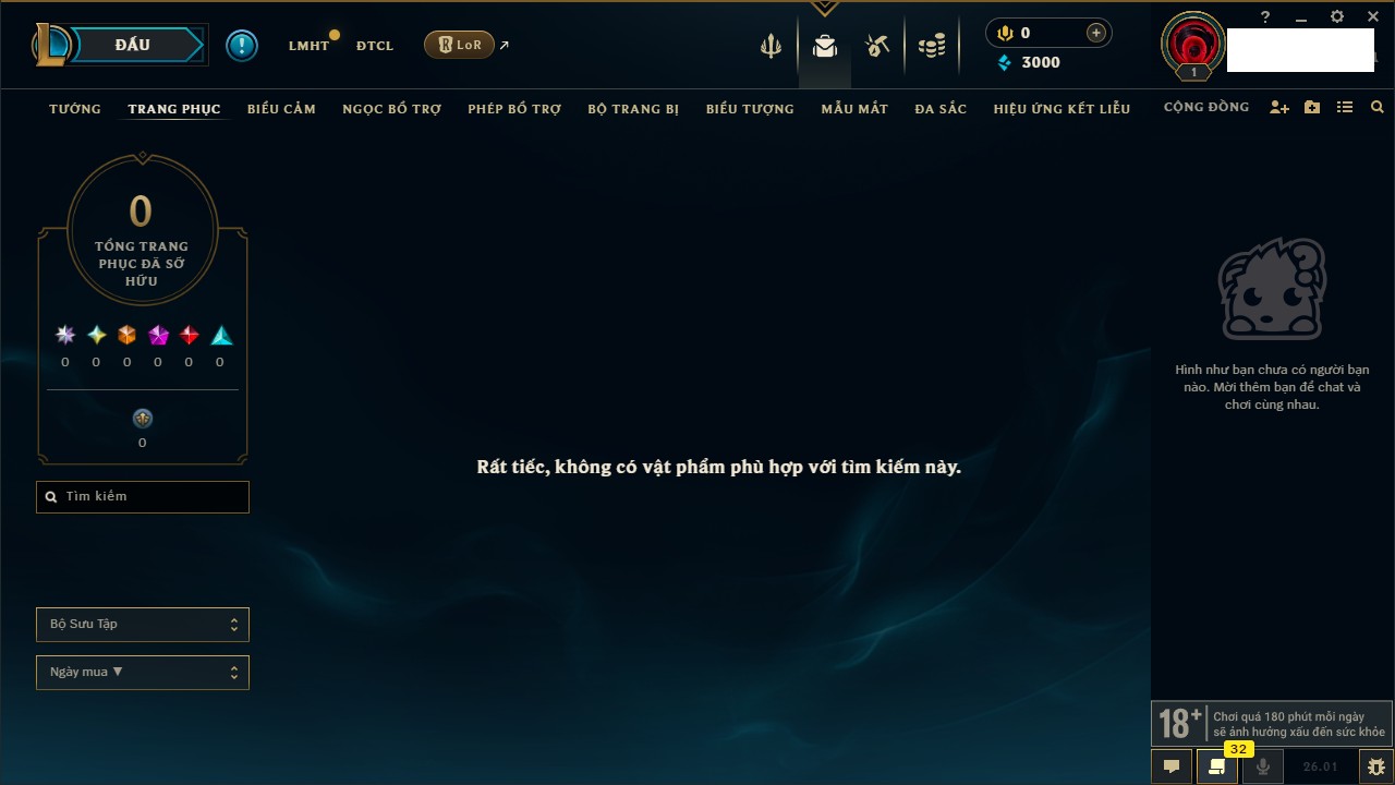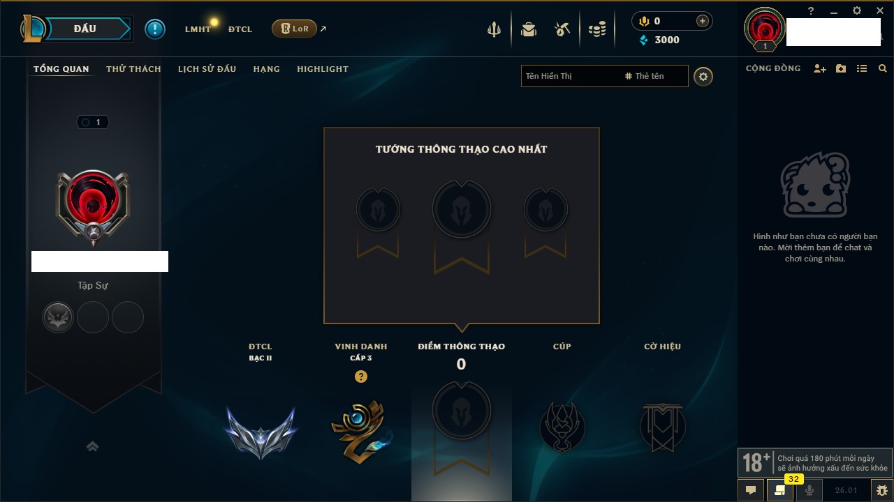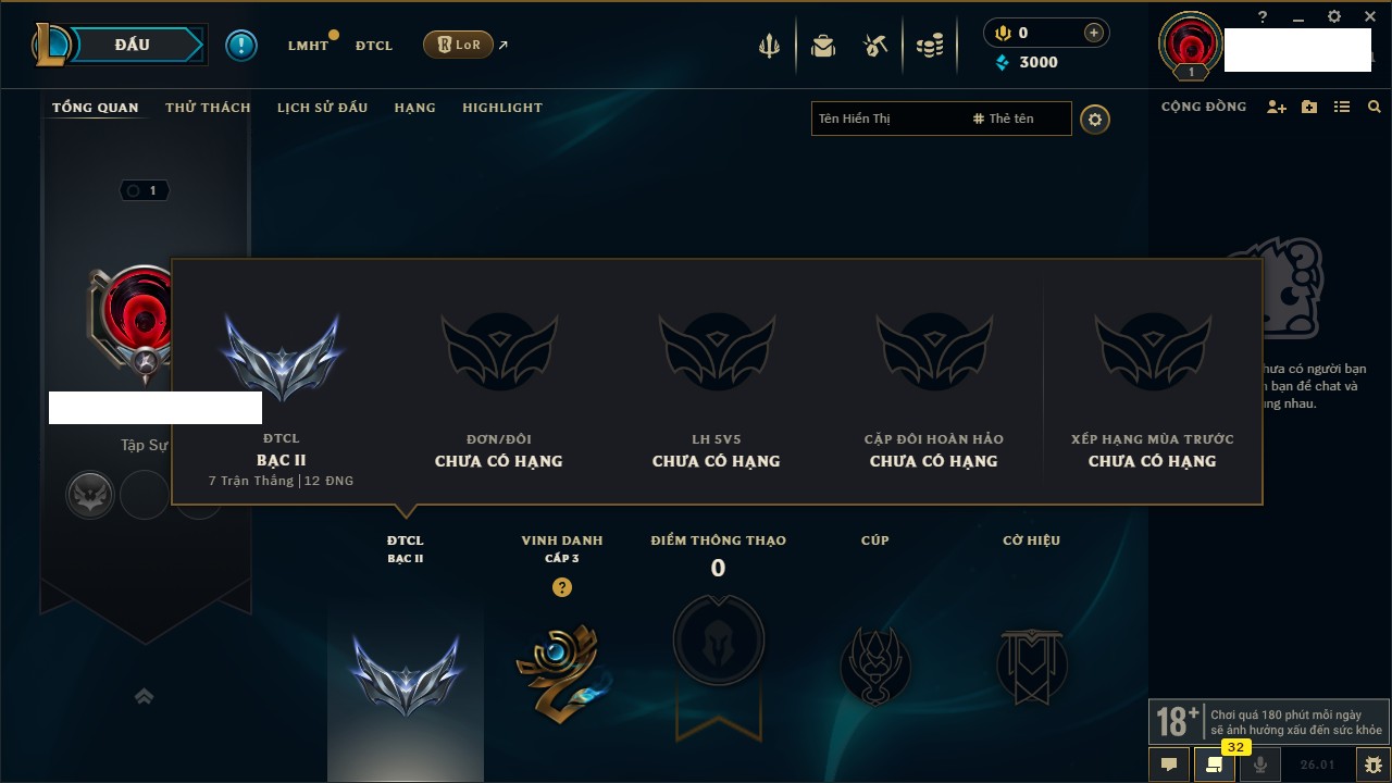Rank Đơn: Chưa RankKhung: Chưa có khungTướng: 165 - Còn 79975 THXTrang Phục: 210Rank ĐTCL: Chưa RankLinh Thú: 149
