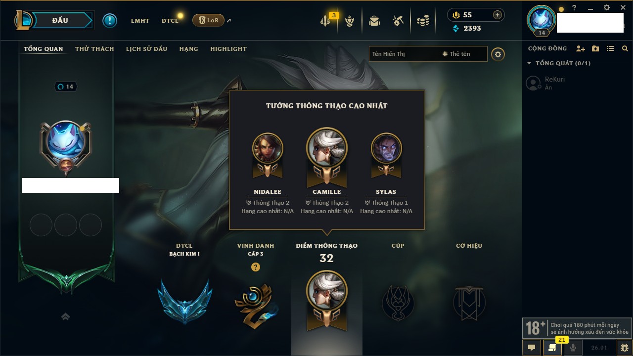 Rank Đơn: Chưa RankKhung: VàngTướng: 171 - Còn 660284 THXTrang Phục: 199Rank ĐTCL: Chưa RankLinh Thú: 34