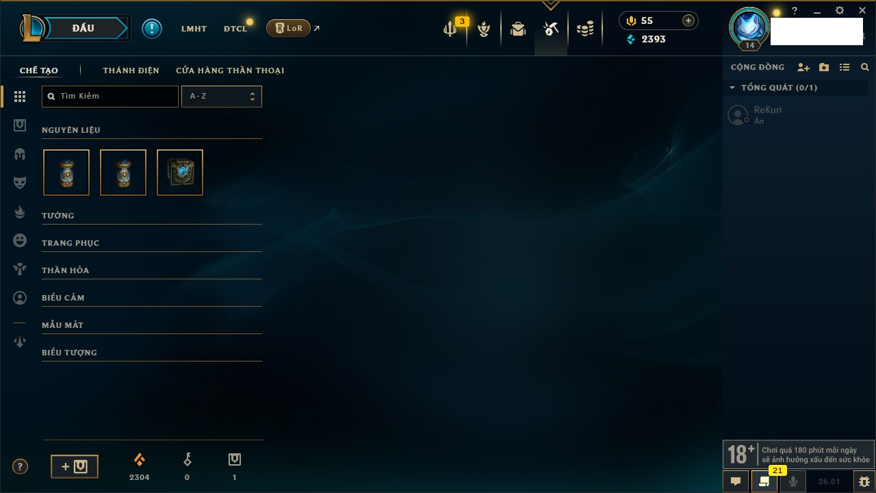 Rank Đơn: Chưa RankKhung: Chưa có khungTướng: 171 - Còn 827961 THXTrang Phục: 193Rank ĐTCL: Chưa RankLinh Thú: 63