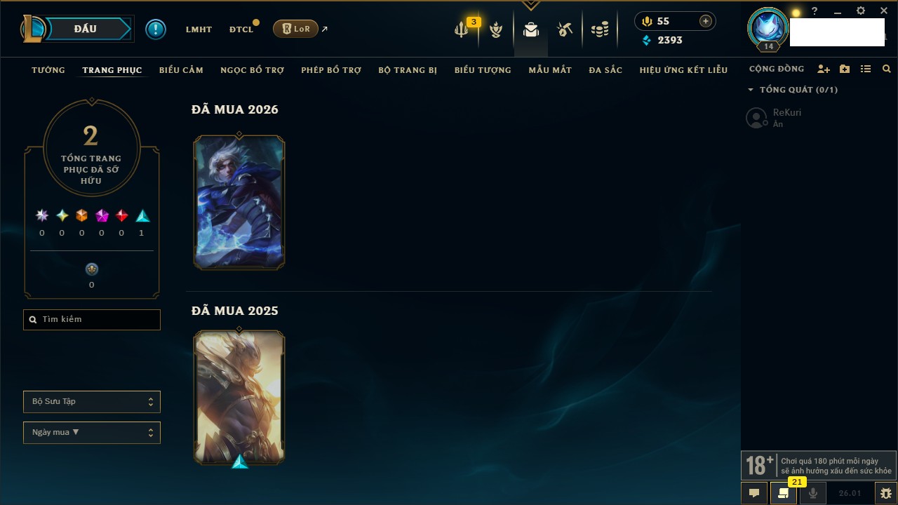 Rank Đơn: Chưa RankKhung: Chưa có khungTướng: 170 - Còn 42144 THXTrang Phục: 82Rank ĐTCL: Chưa RankLinh Thú: 130