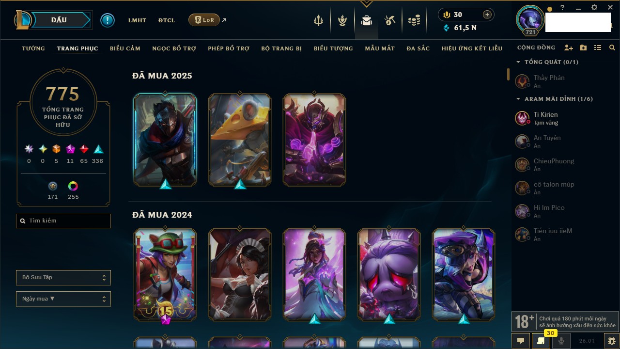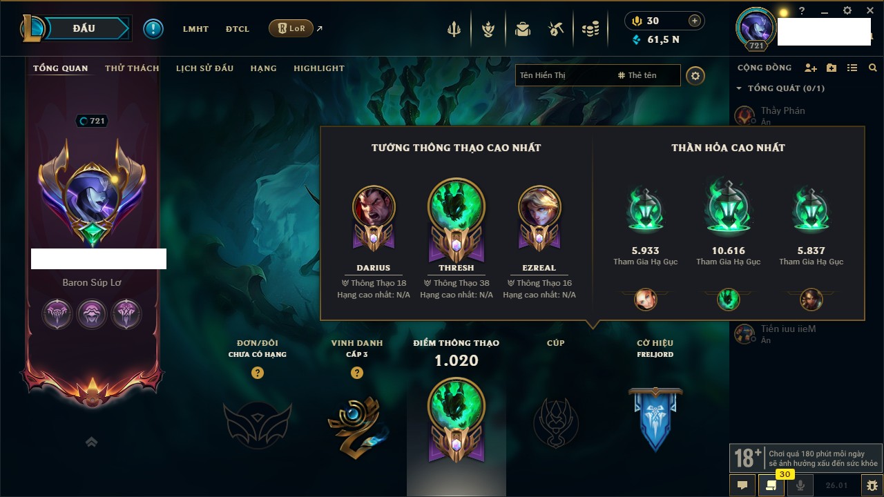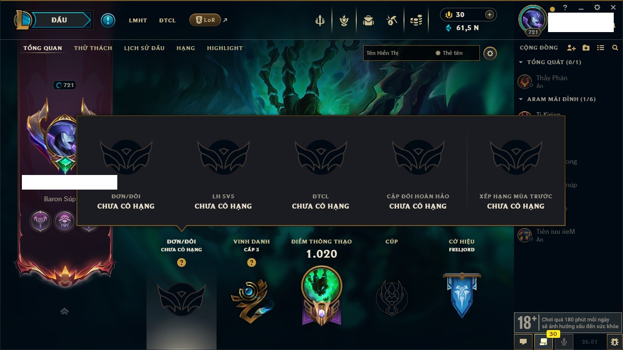 Rank Đơn: Chưa rank mùa nào Khung: Chưa có khung Tướng: 46 - Còn 7820 THX Trang Phục: 12 Rank ĐTCL: Chưa Rank Linh Thú: 250