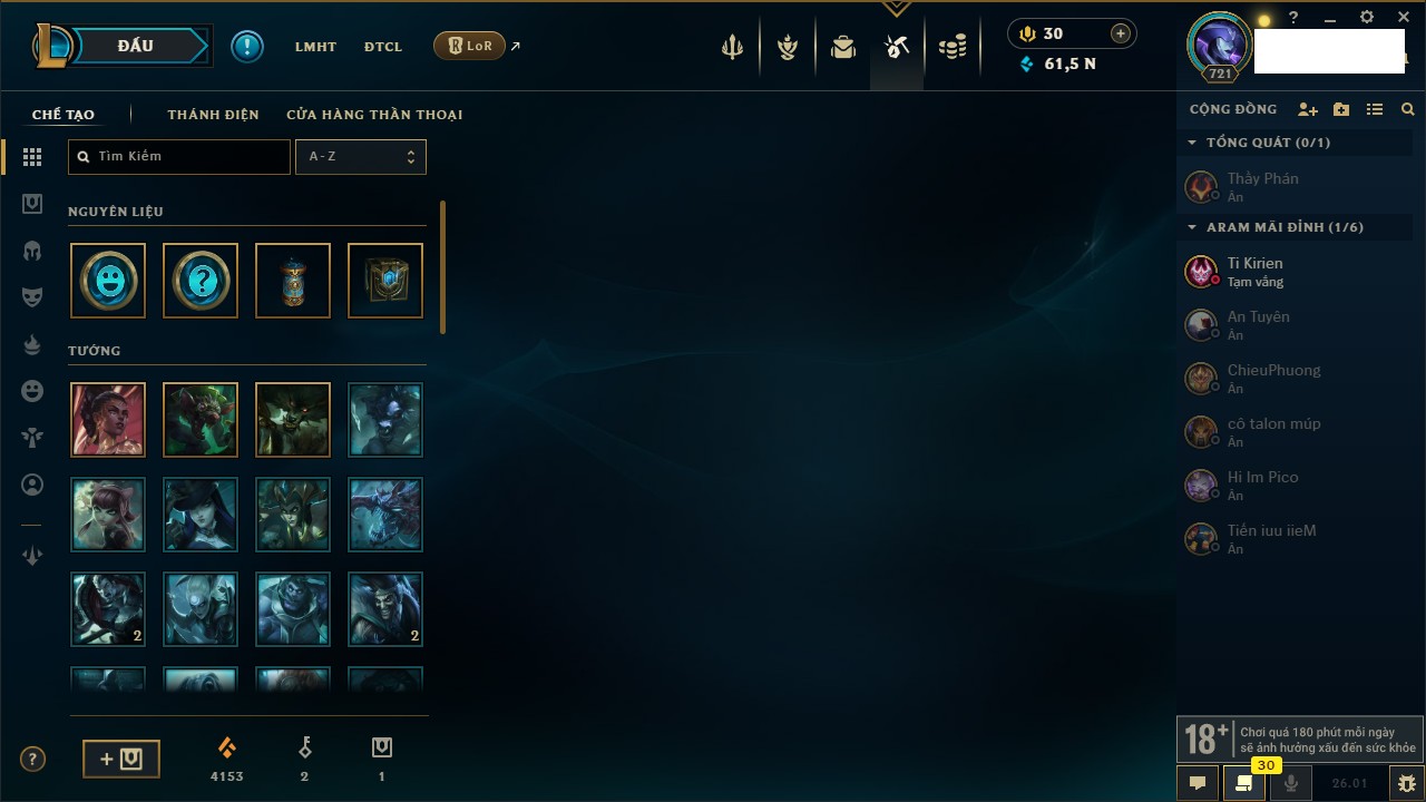 Rank Đơn: Chưa rank mùa nào Khung: Chưa có khung Tướng: 0 - Còn 10050 THX Trang Phục: 1 Rank ĐTCL: Chưa Rank Linh Thú: 143